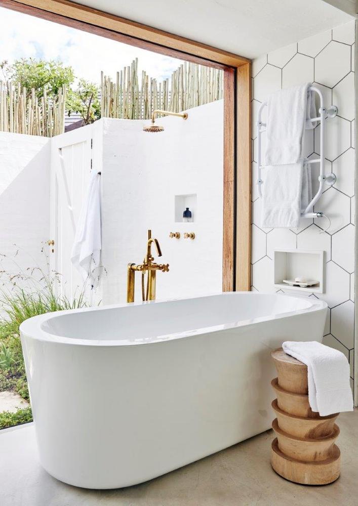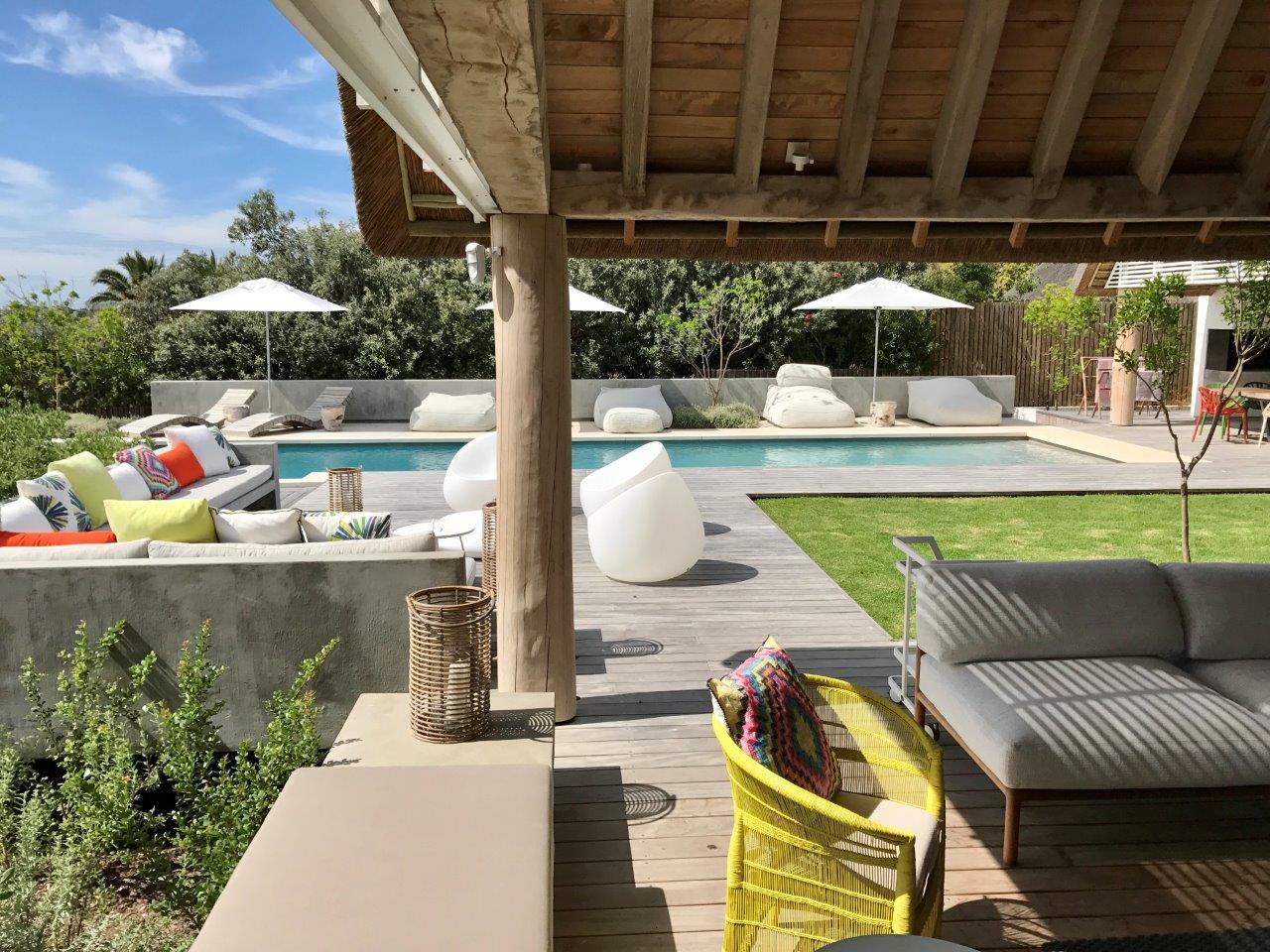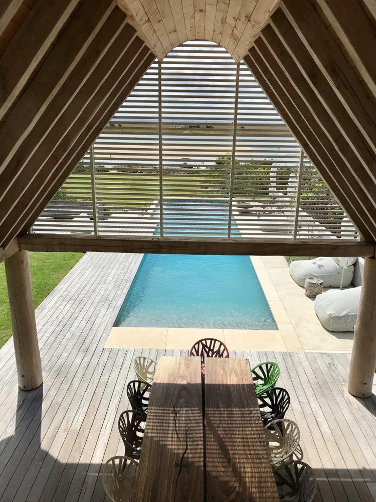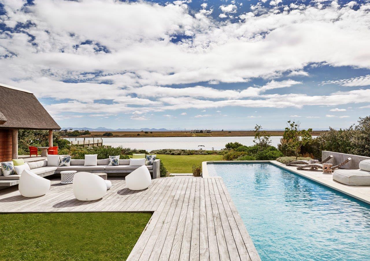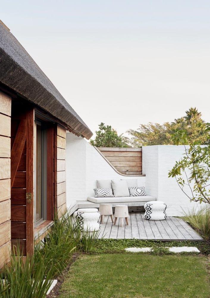 Z podwyższonego tarasu w salonie znajdują się przestronne miejsca do siedzenia na świeżym powietrzu, które otwierają się na widok. Z jednej strony otoczone skrzydłem głównej sypialni, a z drugiej 18-metrowym basenem. Ich liniowość podkreśla perspektywę, otwierając widok na rzekę. Basen z długimi, niskimi, białymi ścianami przypomina stary zbiornik. Przywrócona została rodzima roślinność lasu wydmowego, a szare odcienie wzmocniły dominujące w domu kolory. Z tarasu przy basenie drewniane kładki wiją się przez ogród, prowadząc w dół do małej plaży nad rzeką z pomostem.