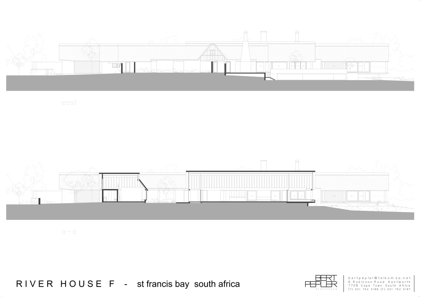 Oryginalny dom umieszczony z tyłu terenu, pozbawiony endemicznego krajobrazu został zburzony, aby zrobić miejsce dla River House F. Otoczenie jest idylliczne, ale warunki mogą się nieoczekiwanie zmienić, a dominujące wiatry ze wschodu i zachodu są silnymi wyznacznikami projektu. Nadrzędna koncepcja projektowa zakładała wykorzystanie elementów architektonicznych do połączenia lądu z wodą. Liniowe formy rozciągają się od ulicy prowadzącej od wejścia przez dom, do części mieszkalnych i zewnętrznych tarasów. W przeciwieństwie do linearności form, trzy duże rzeźbiarskie kominy zakotwiczają dom i zapewniają wertykalność niezbędną do zrównoważenia kompozycji. Wspaniałe widoki na rzekę można podziwiać z ogrodu, który rozciągającego się w dół łącząc się z trawami rzecznymi na plaży.