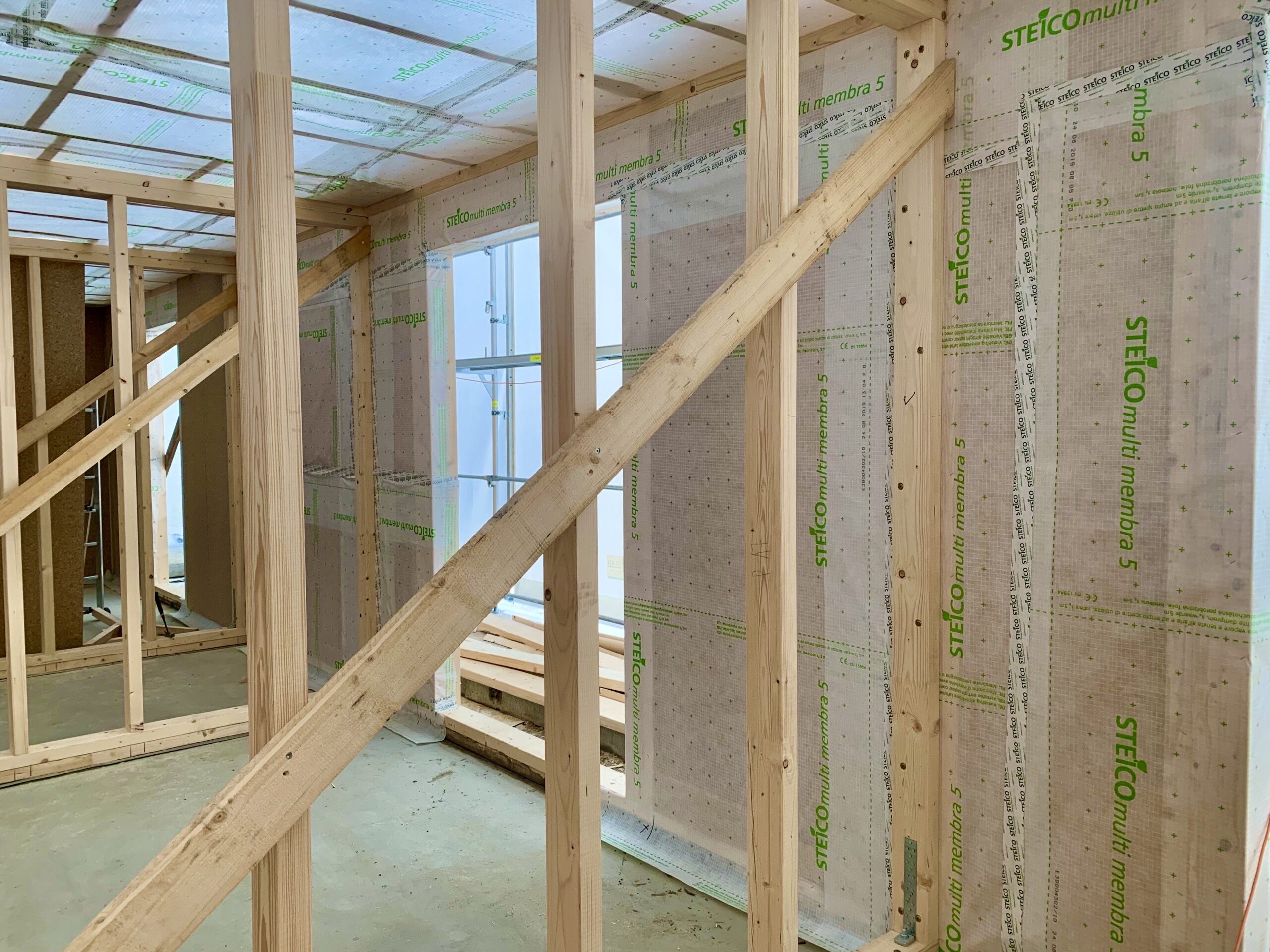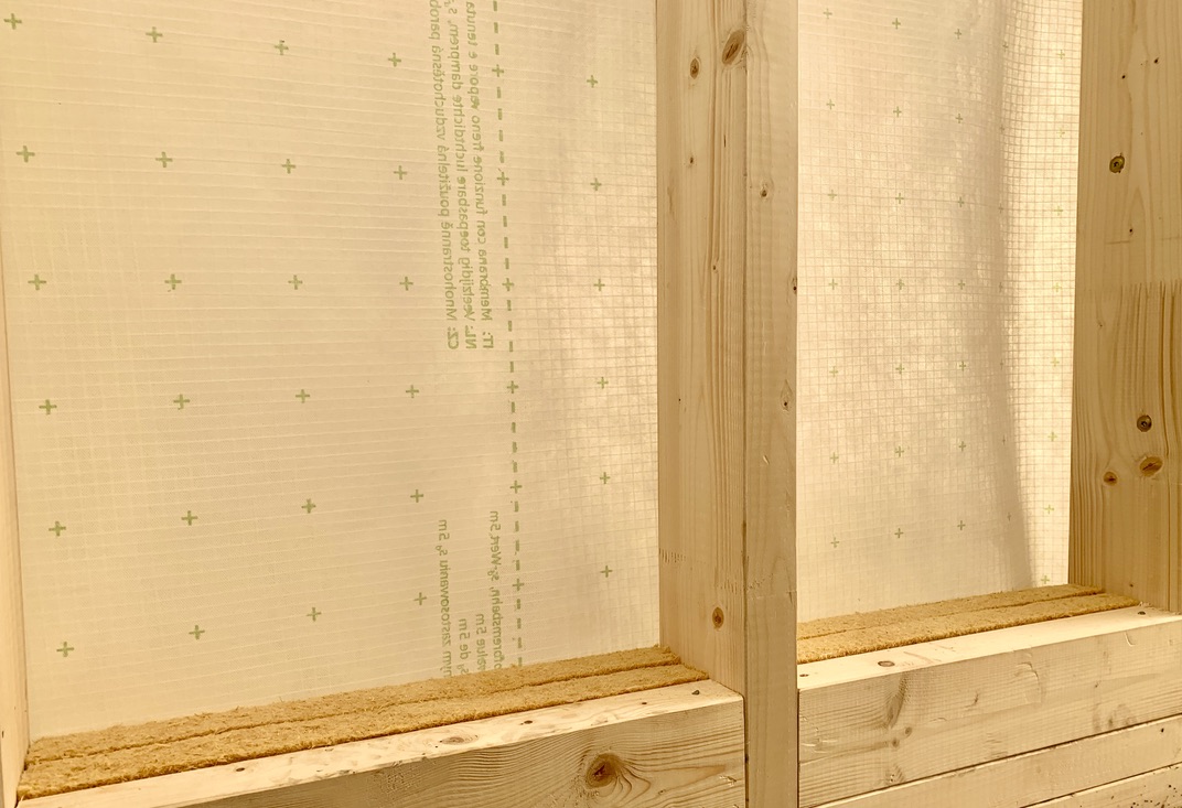 Belki podwalinowe należy również zabezpieczyć za pomocą membrany paroizolacyjnej. Pasy membrany należy szczelnie połączyć z membranami znajdującymi się na nieotworowanej części przegrody. Tu szczególną uwagę należy zwrócić na szczelne wyklejenie narożników wewnętrznych otworów okiennych. Tą niezwykle istotna pracę łatwiej wykonać z użyciem wysokoelastycznej taśmy klejącej.