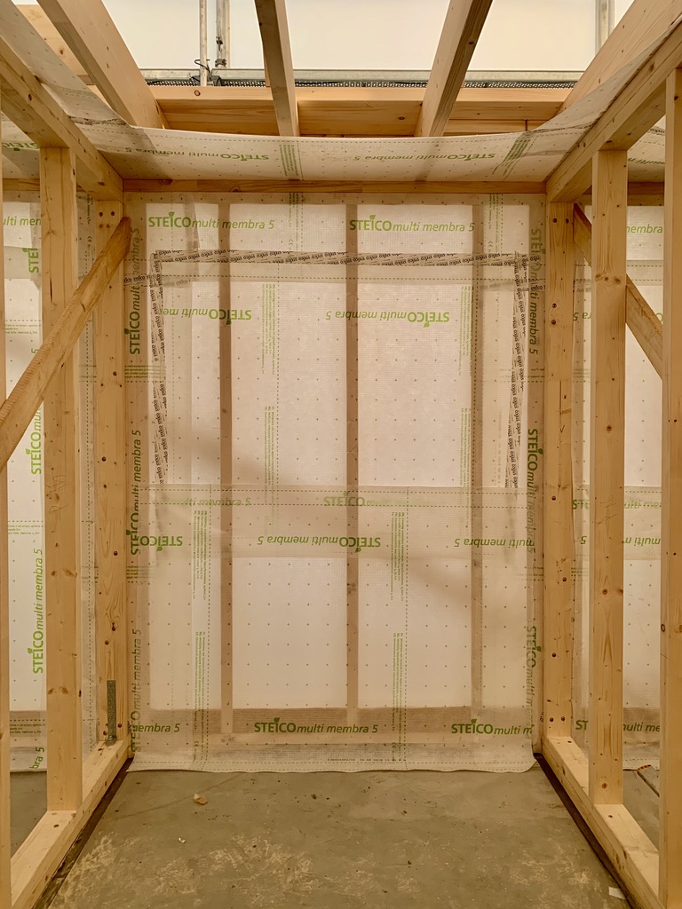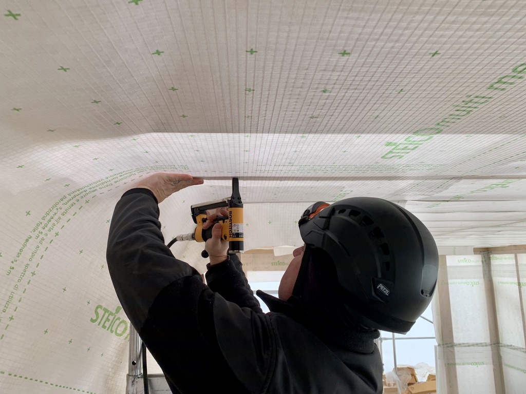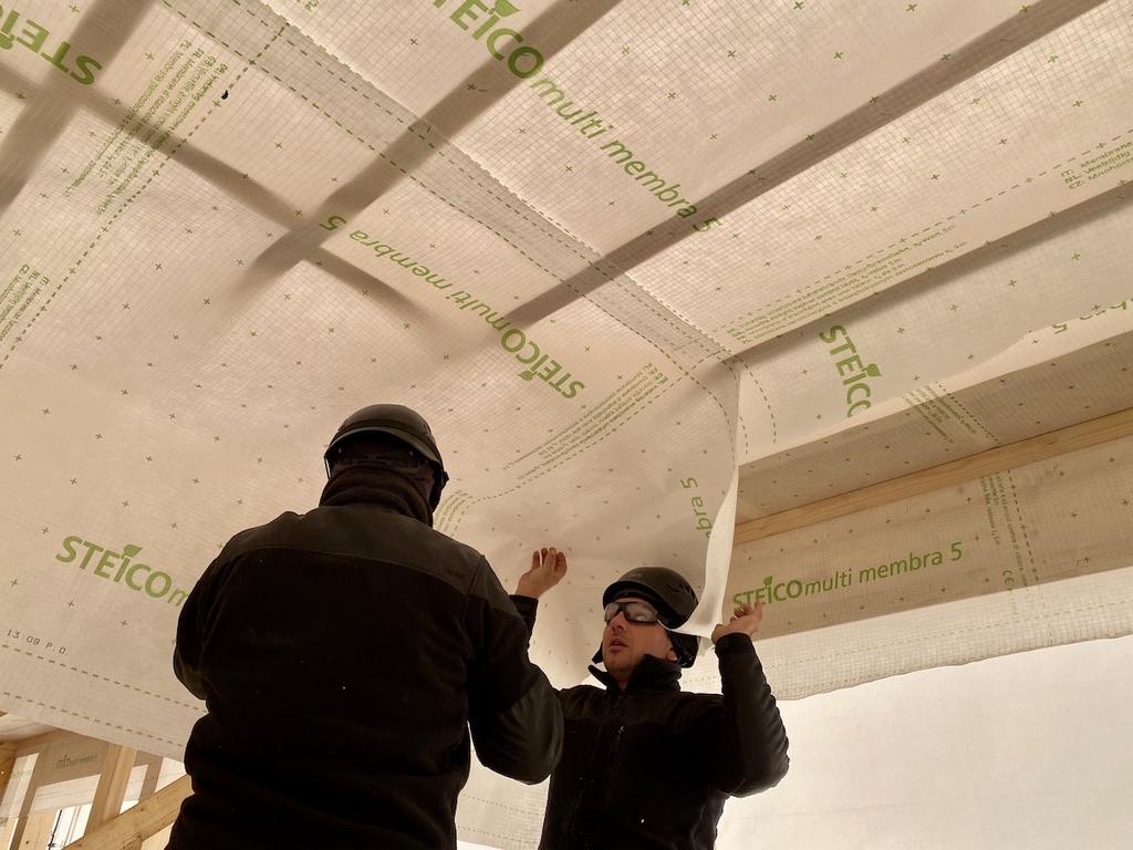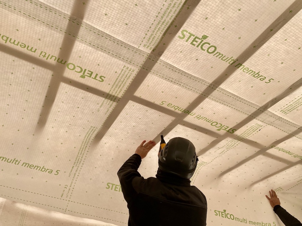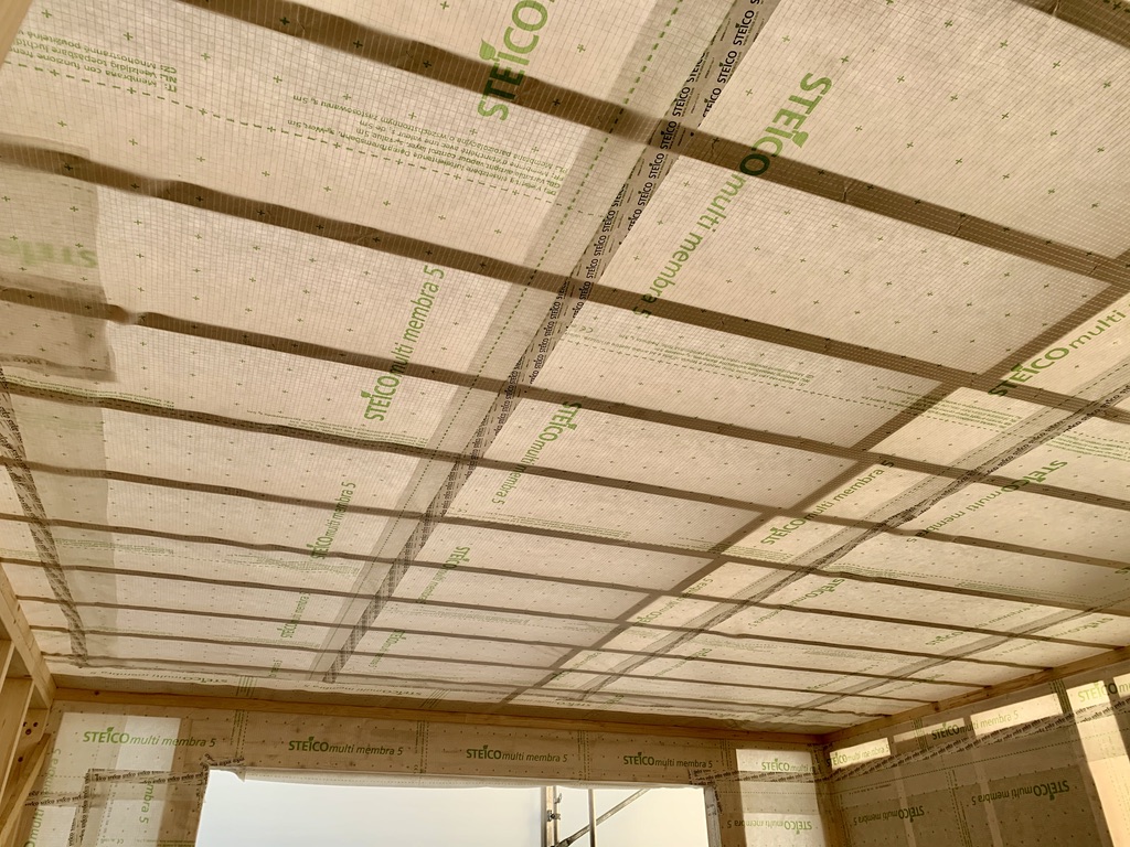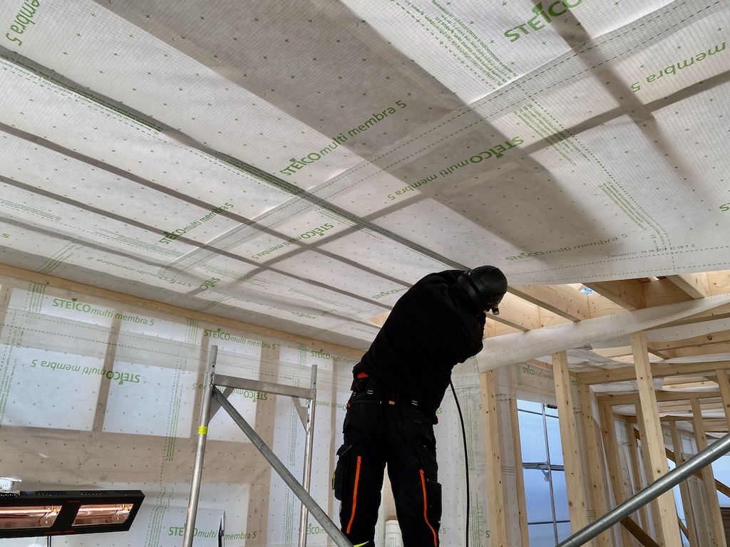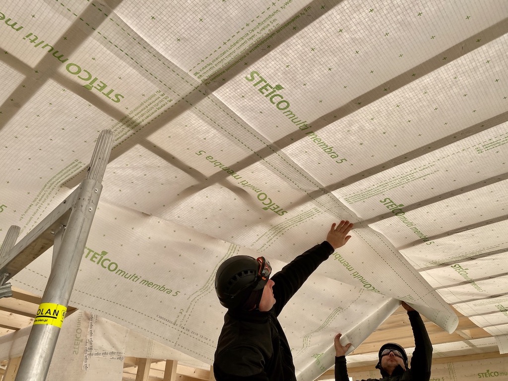 Na tym etapie prowadzenia prac należy bezwzględnie połączyć wszelkie, przygotowane wcześniej fartuchy membran paroizolacyjnych z membranami rozkładanymi na płaszczyznach przegród.