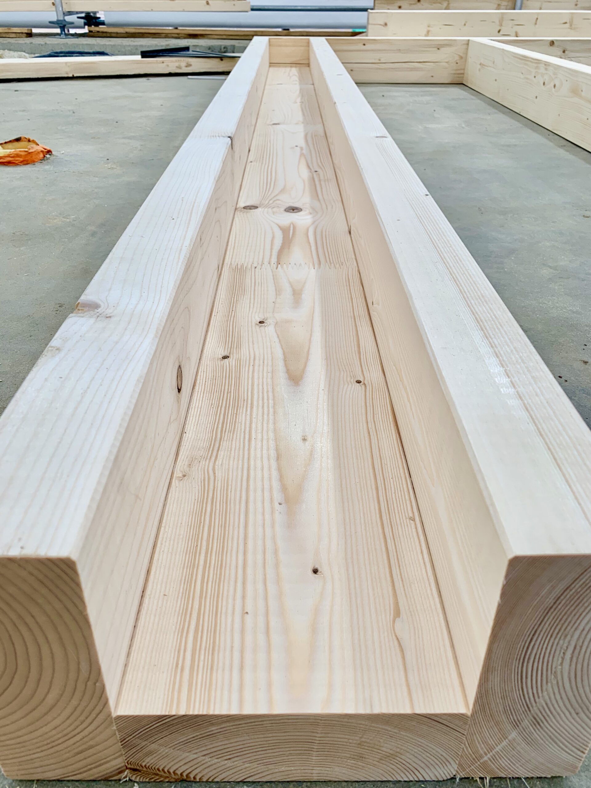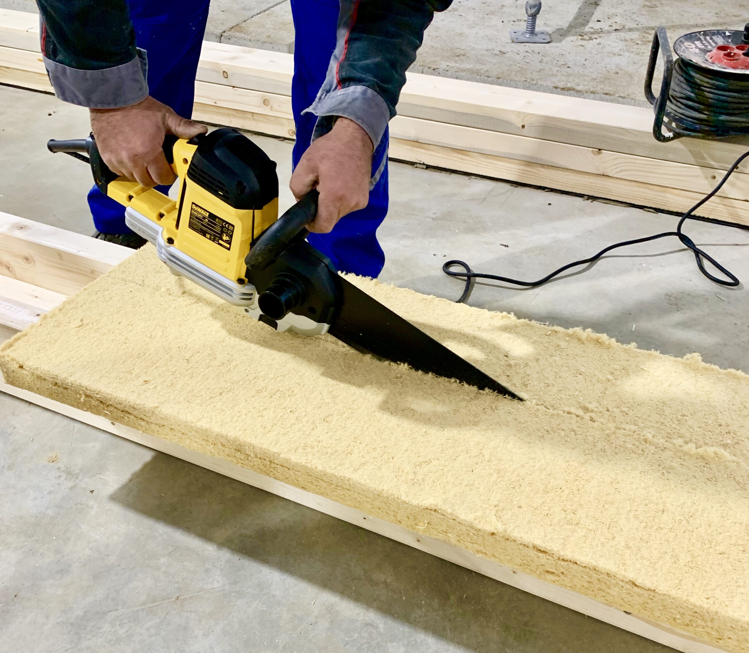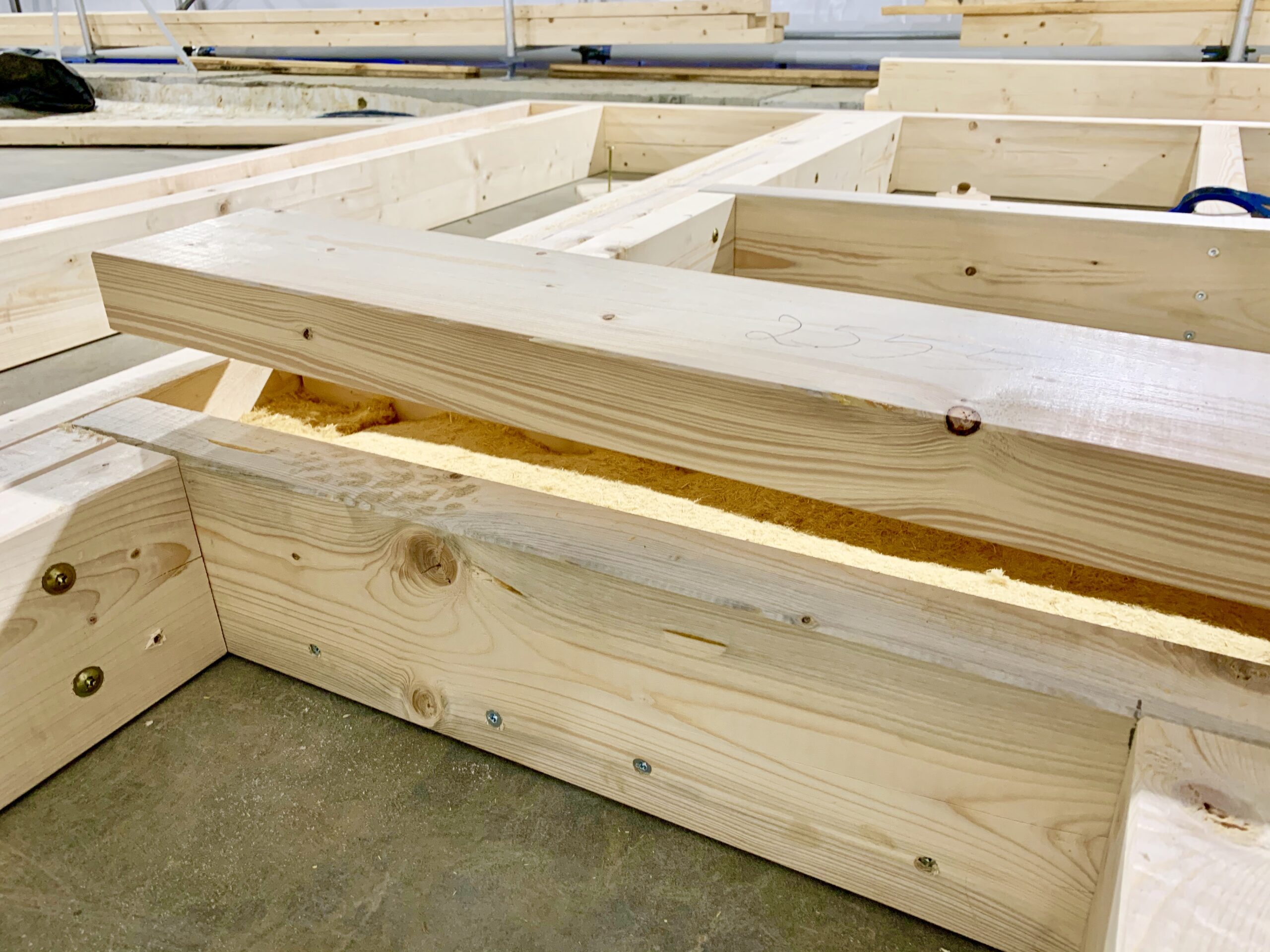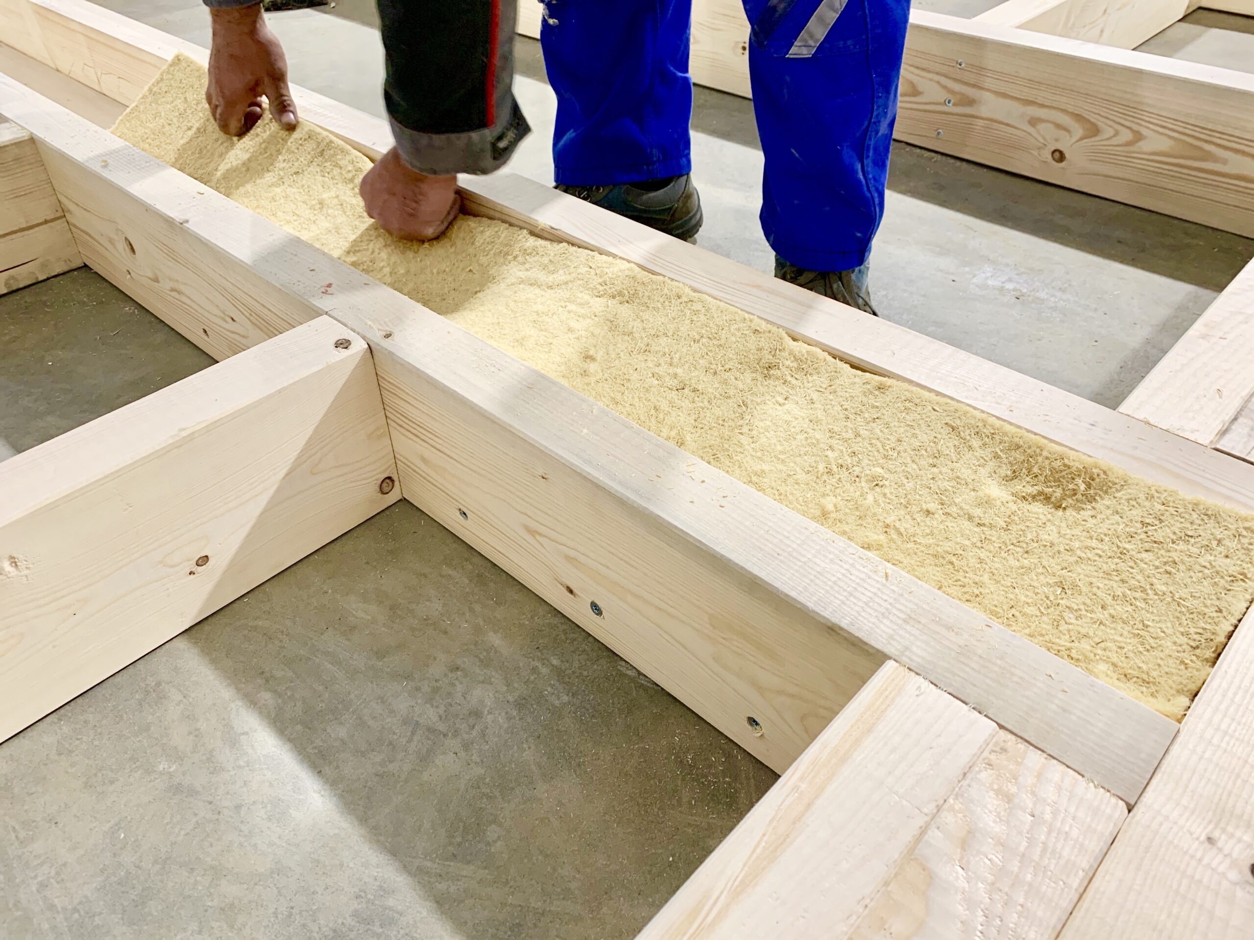 Elementem odrębnym są elementy nadprożowe. Te skręcamy ze sobą tworząc skrzynię wypełnioną izolacją termiczną STEICO flex.