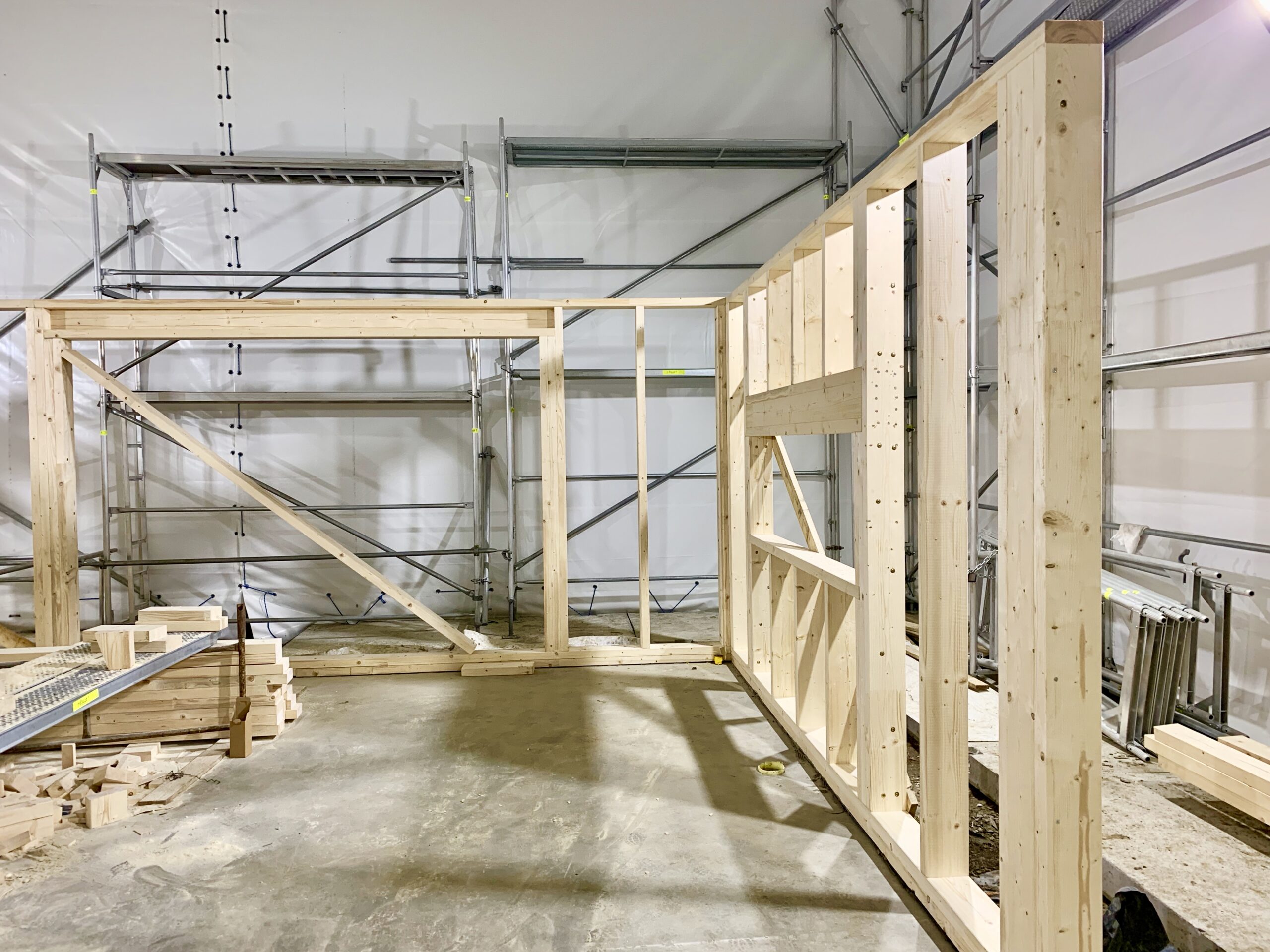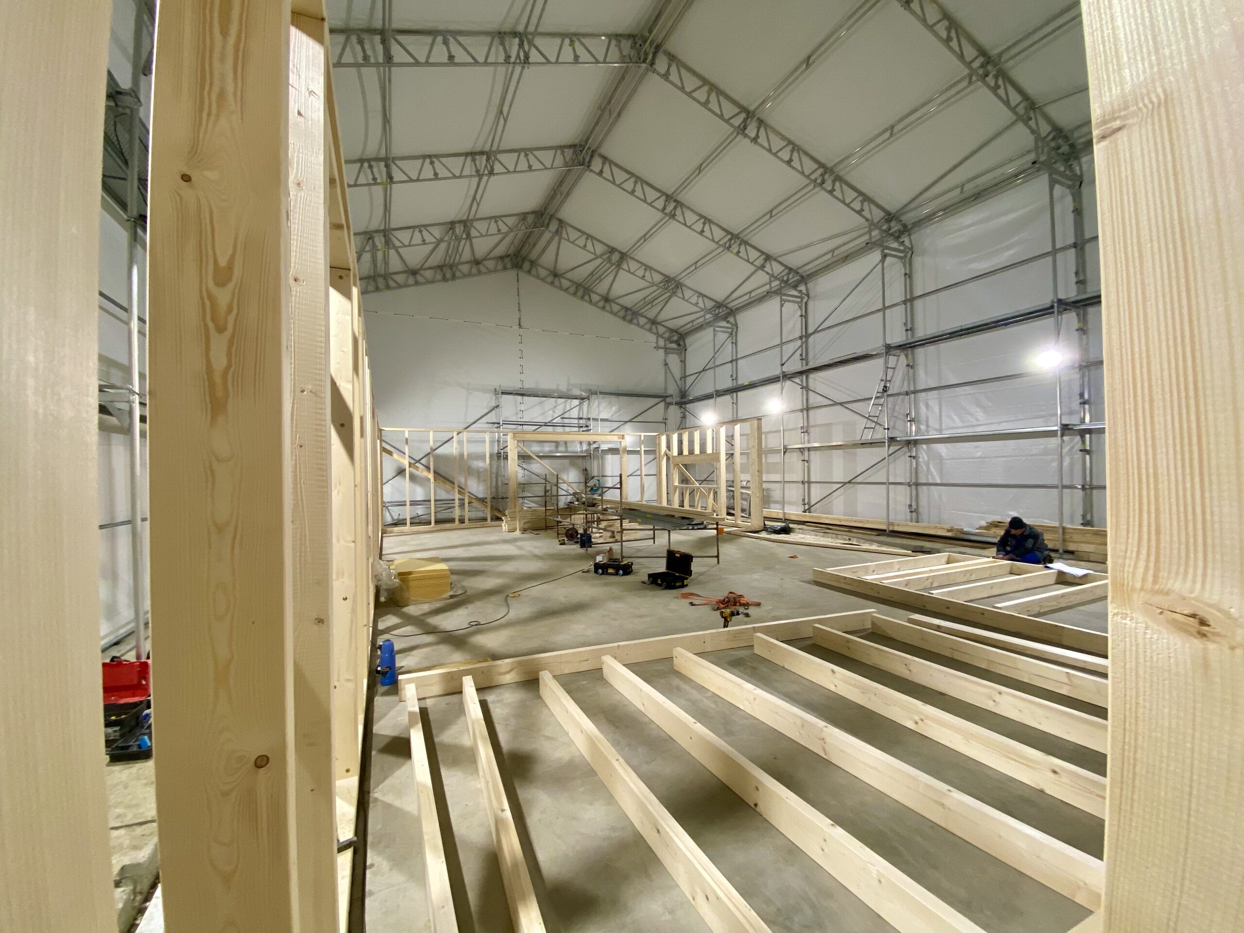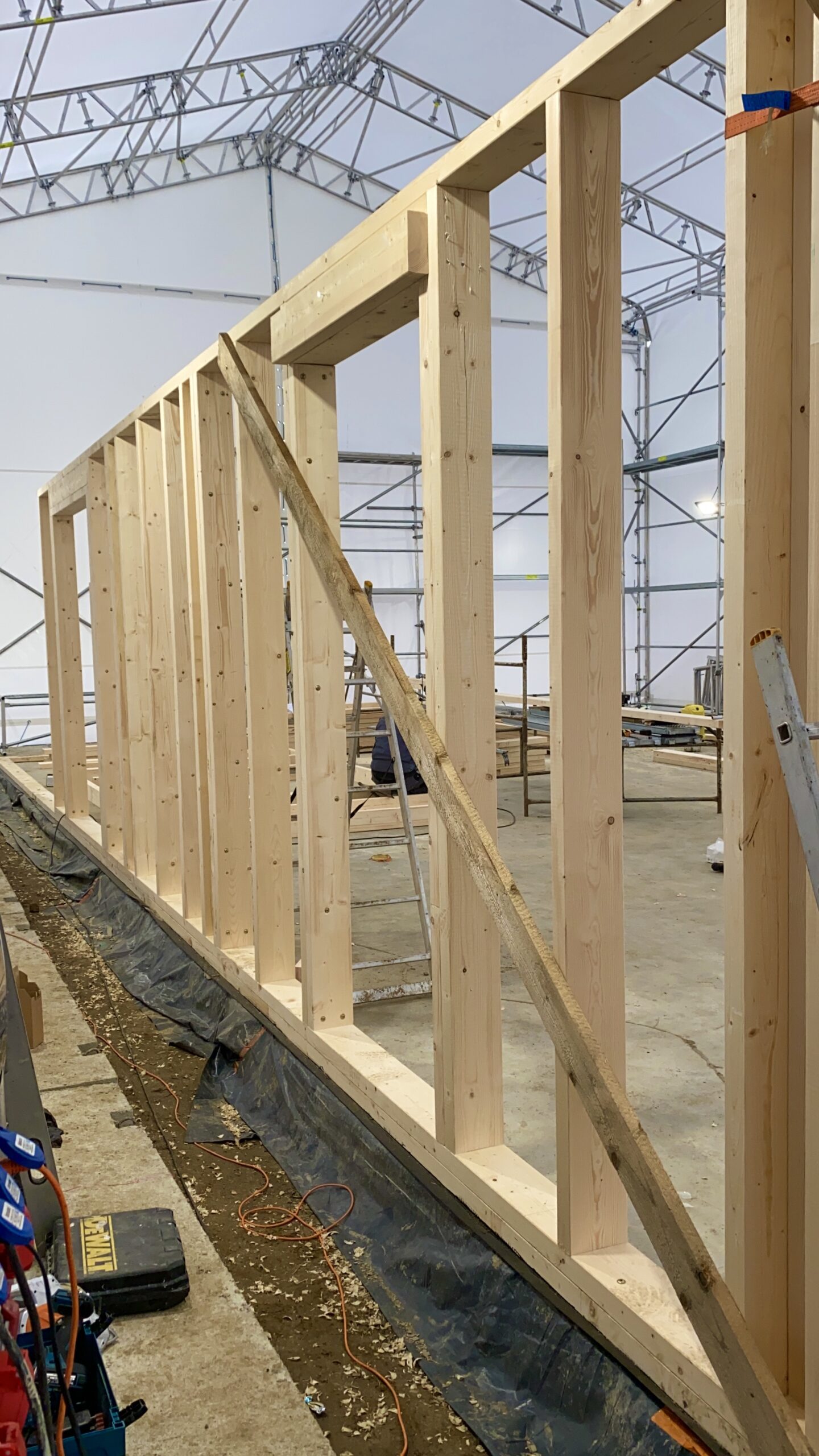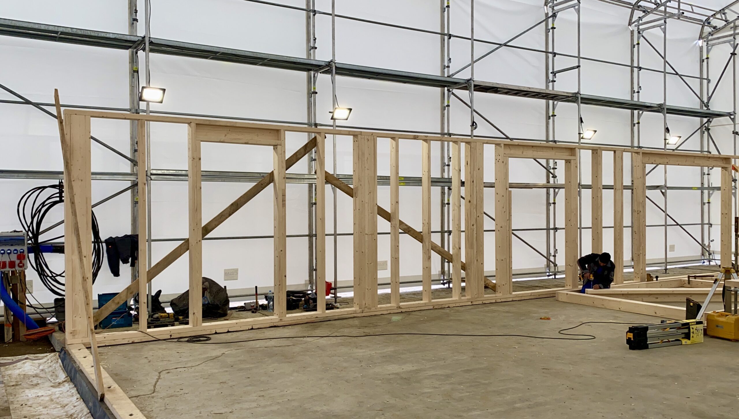 Pierwszymi elementami ściany konstrukcyjnej są naroża obiektu. Po ich zespoleniu, ustawiamy elementy pod kątem prostym względem siebie i tymczasowo dokręcamy elementy do podłoża. Konstrukcję ścian usztywniamy nie tylko za pomocą zastrzałów, ale również za pomocą deski przykręconej pomiędzy norożnymi ścianami – po szczytach oczepów.