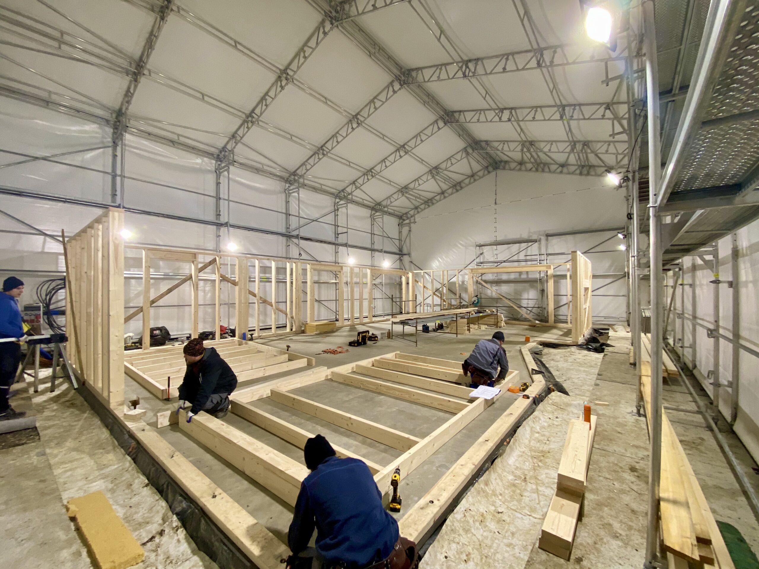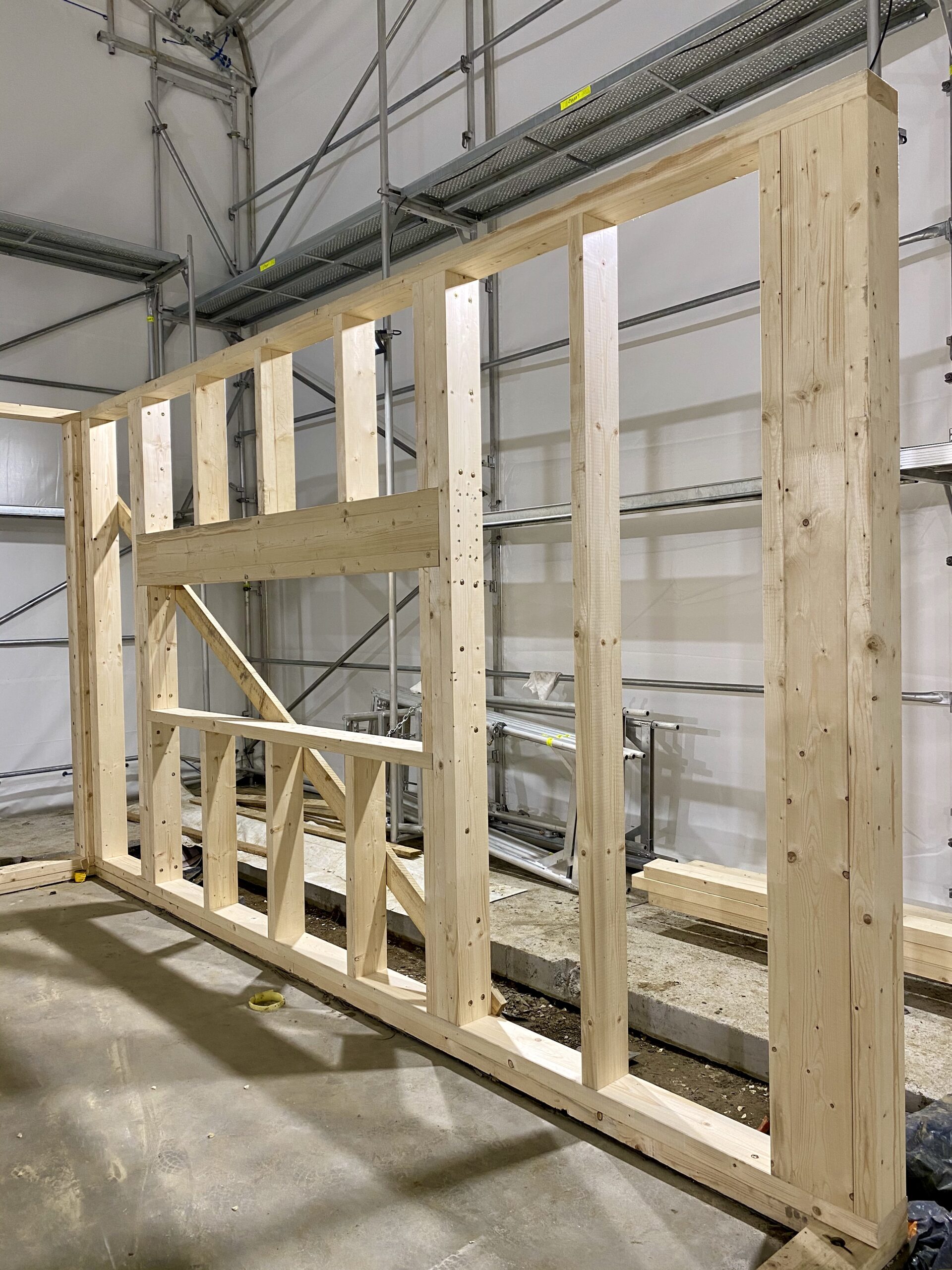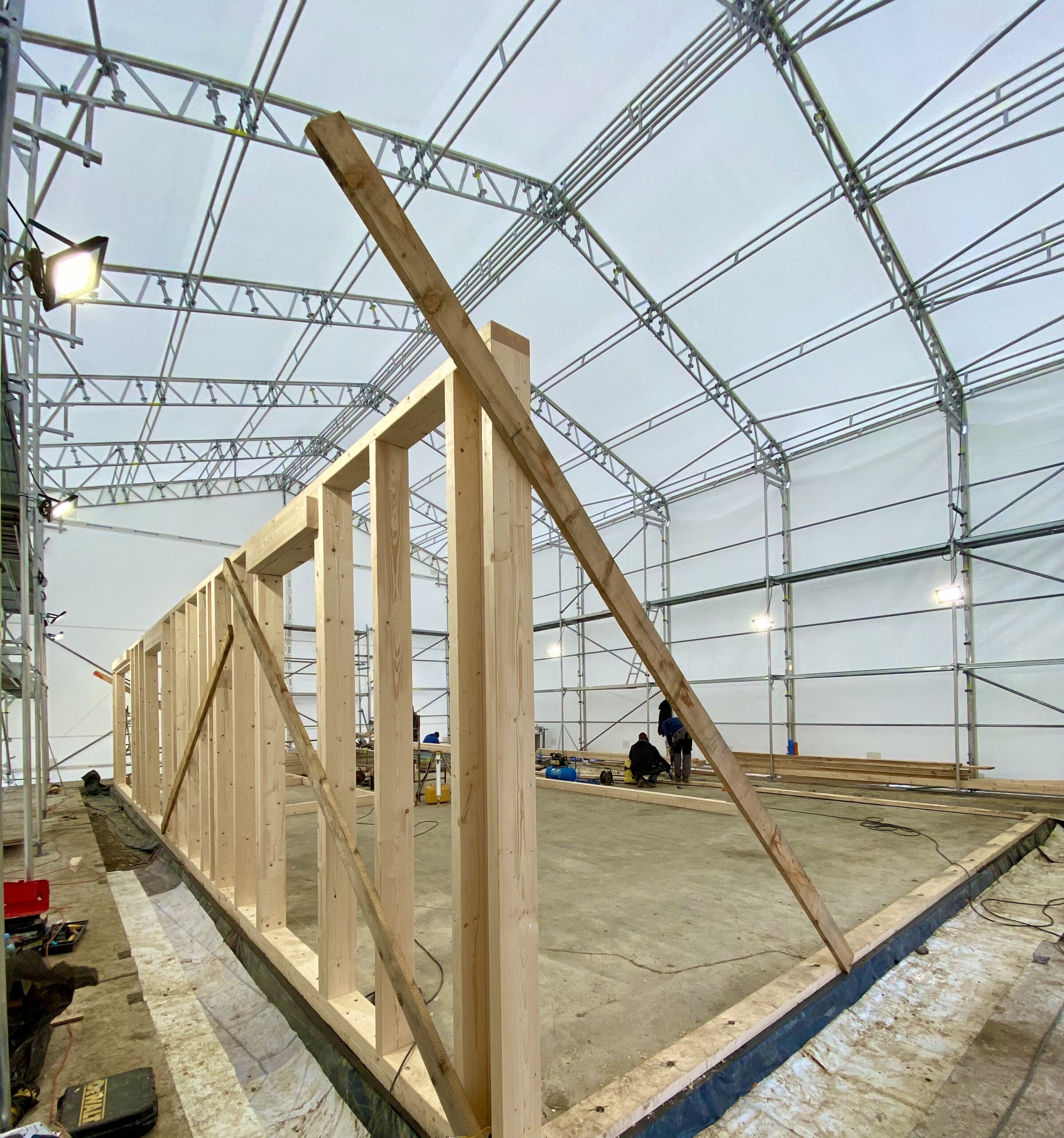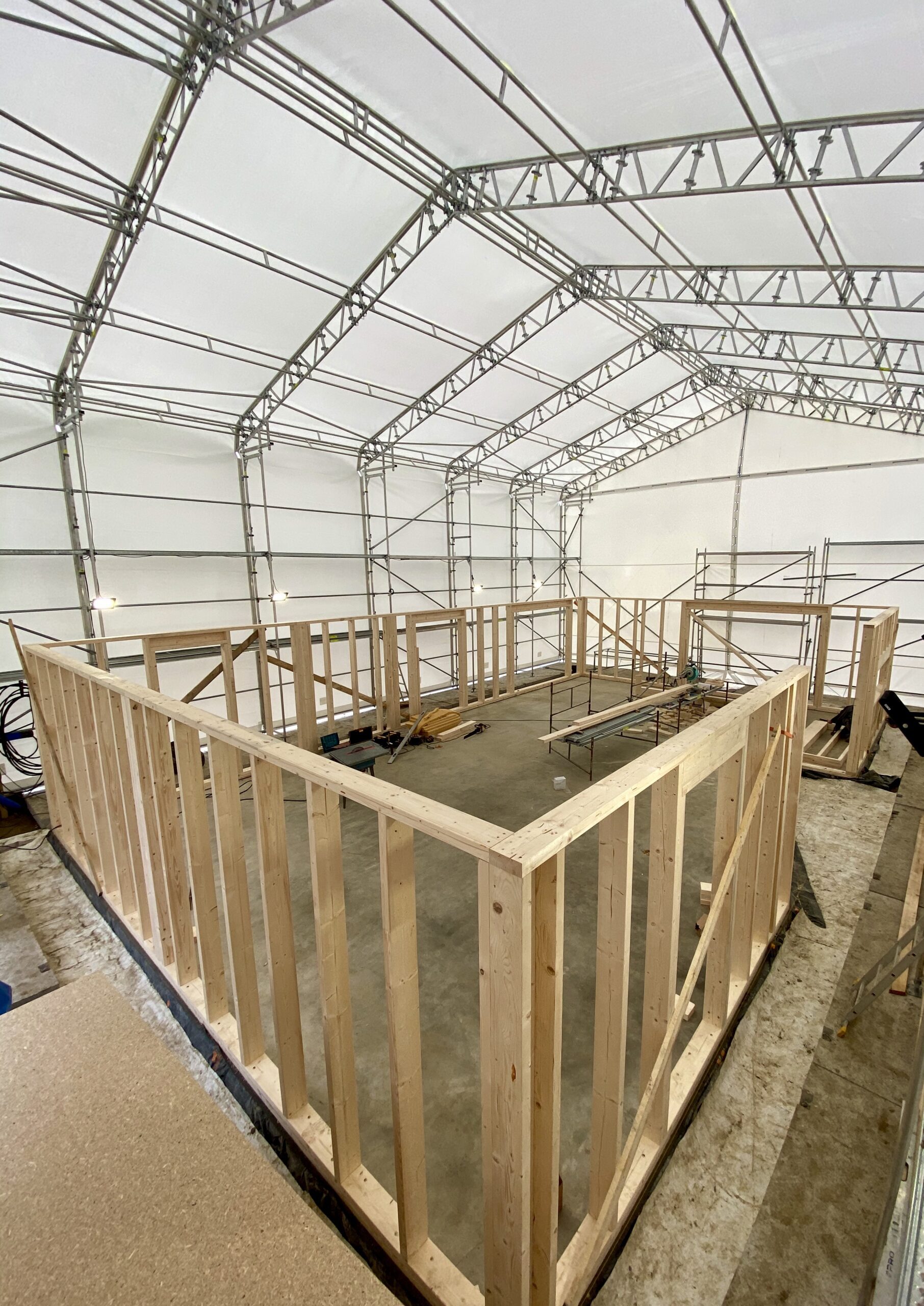 Pierwszymi elementami ściany konstrukcyjnej są naroża obiektu. Po ich zespoleniu, ustawiamy elementy pod kątem prostym względem siebie i tymczasowo dokręcamy elementy do podłoża. Konstrukcję ścian usztywniamy nie tylko za pomocą zastrzałów, ale również za pomocą deski przykręconej pomiędzy norożnymi ścianami – po szczytach oczepów.