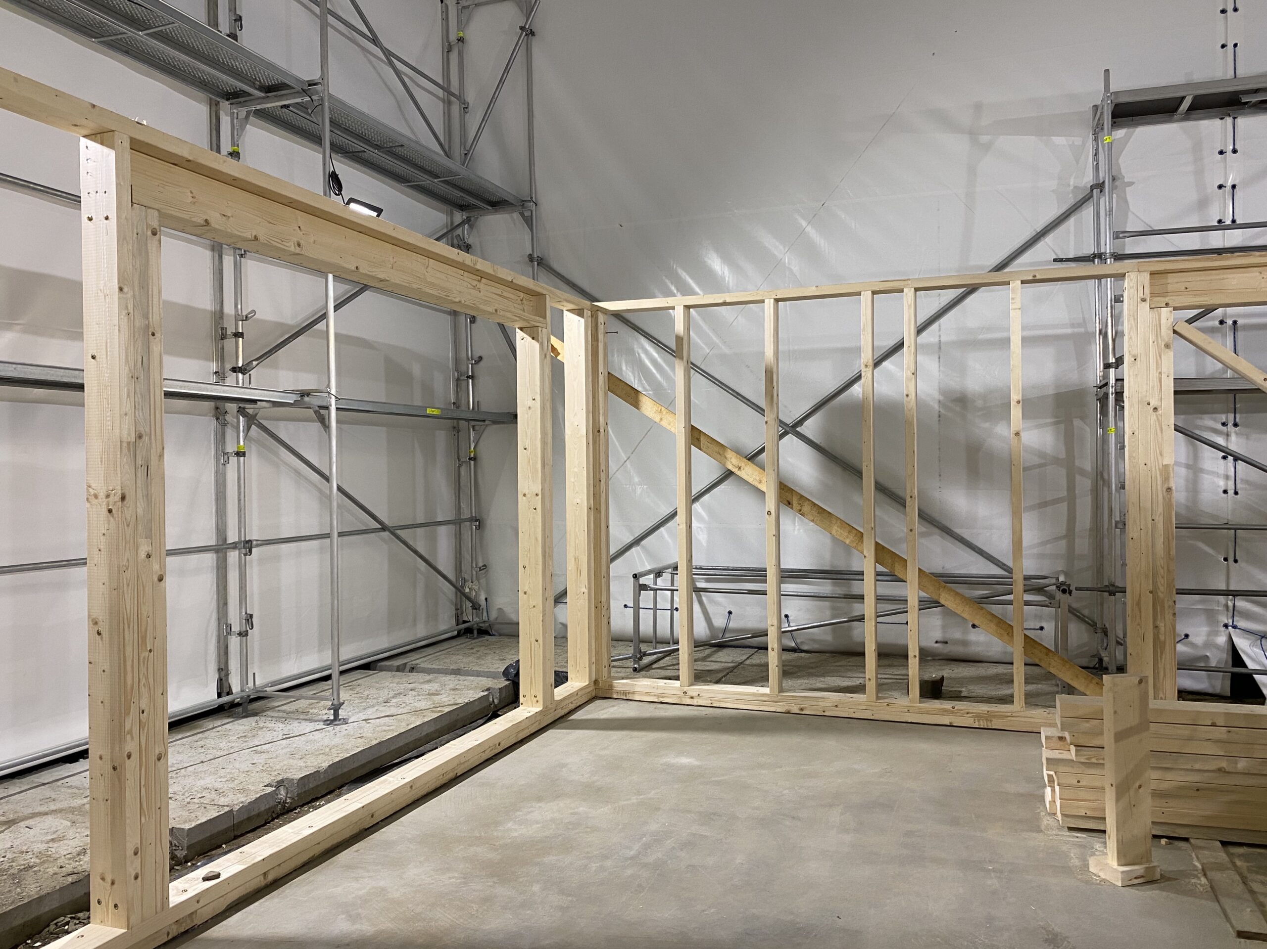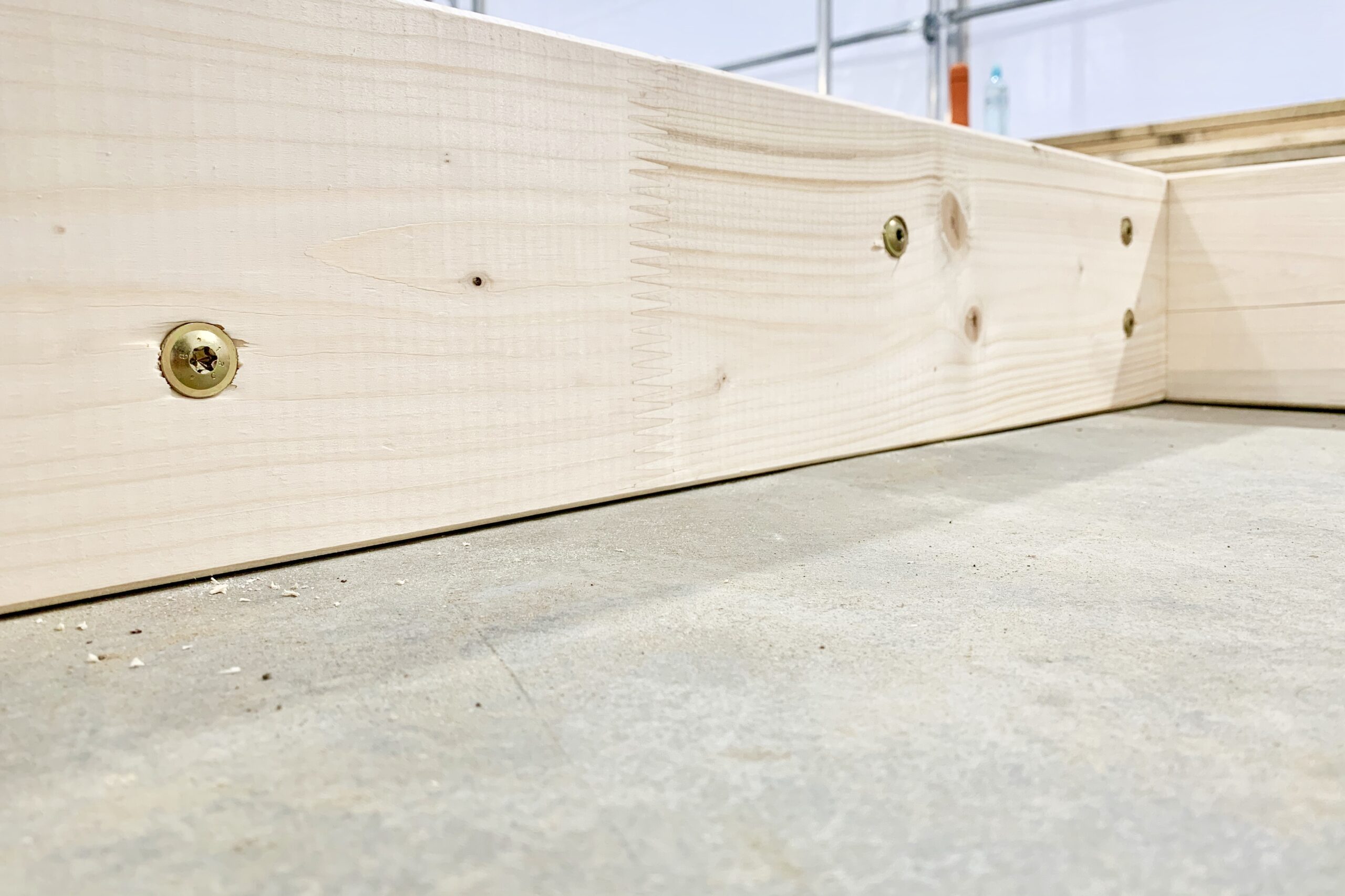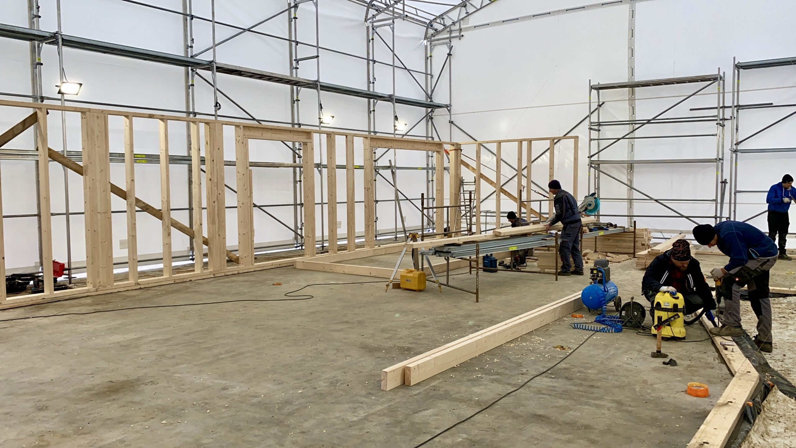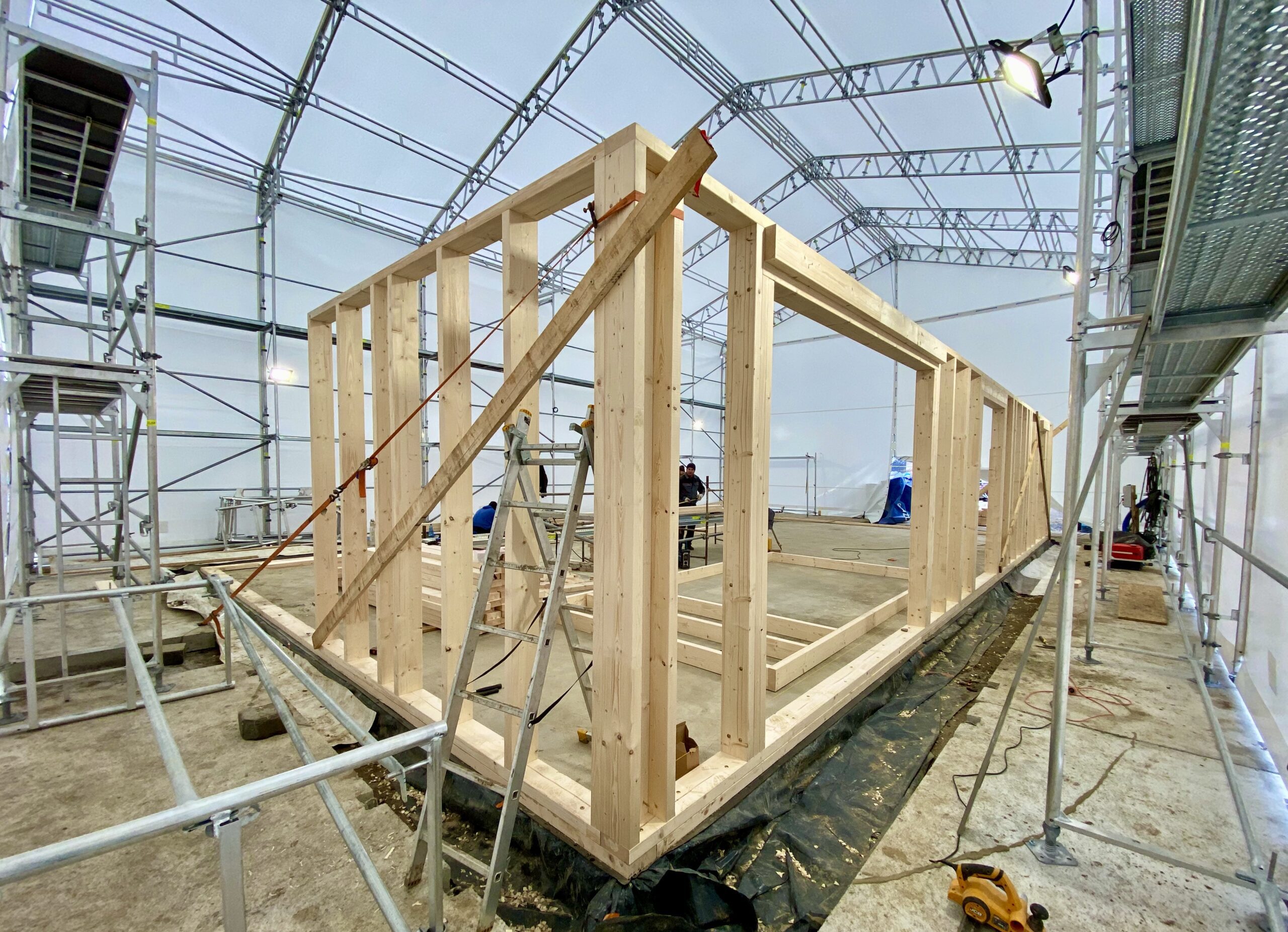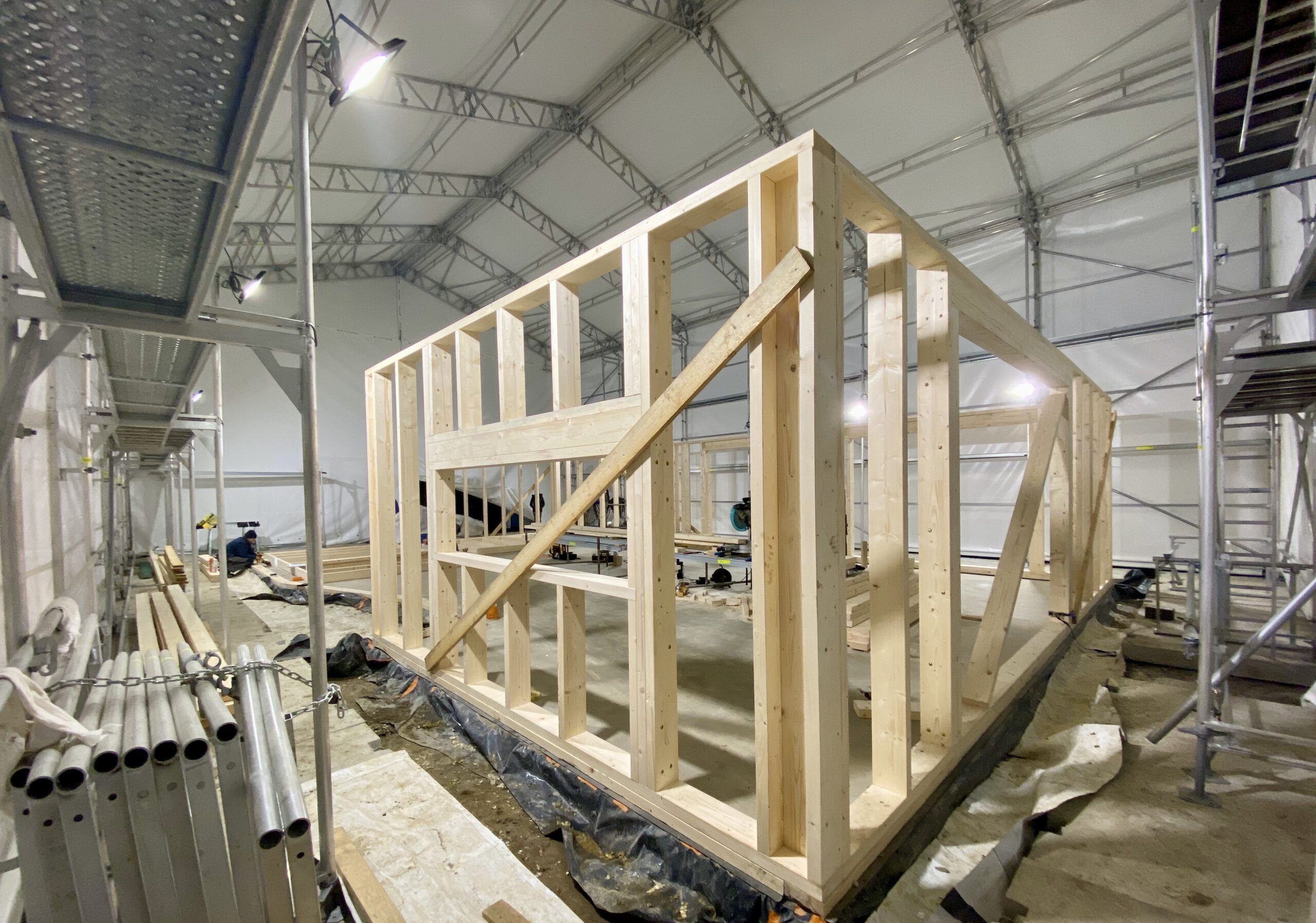 Pierwszymi elementami ściany konstrukcyjnej są naroża obiektu. Po ich zespoleniu, ustawiamy elementy pod kątem prostym względem siebie i tymczasowo dokręcamy elementy do podłoża. Konstrukcję ścian usztywniamy nie tylko za pomocą zastrzałów, ale również za pomocą deski przykręconej pomiędzy norożnymi ścianami – po szczytach oczepów.