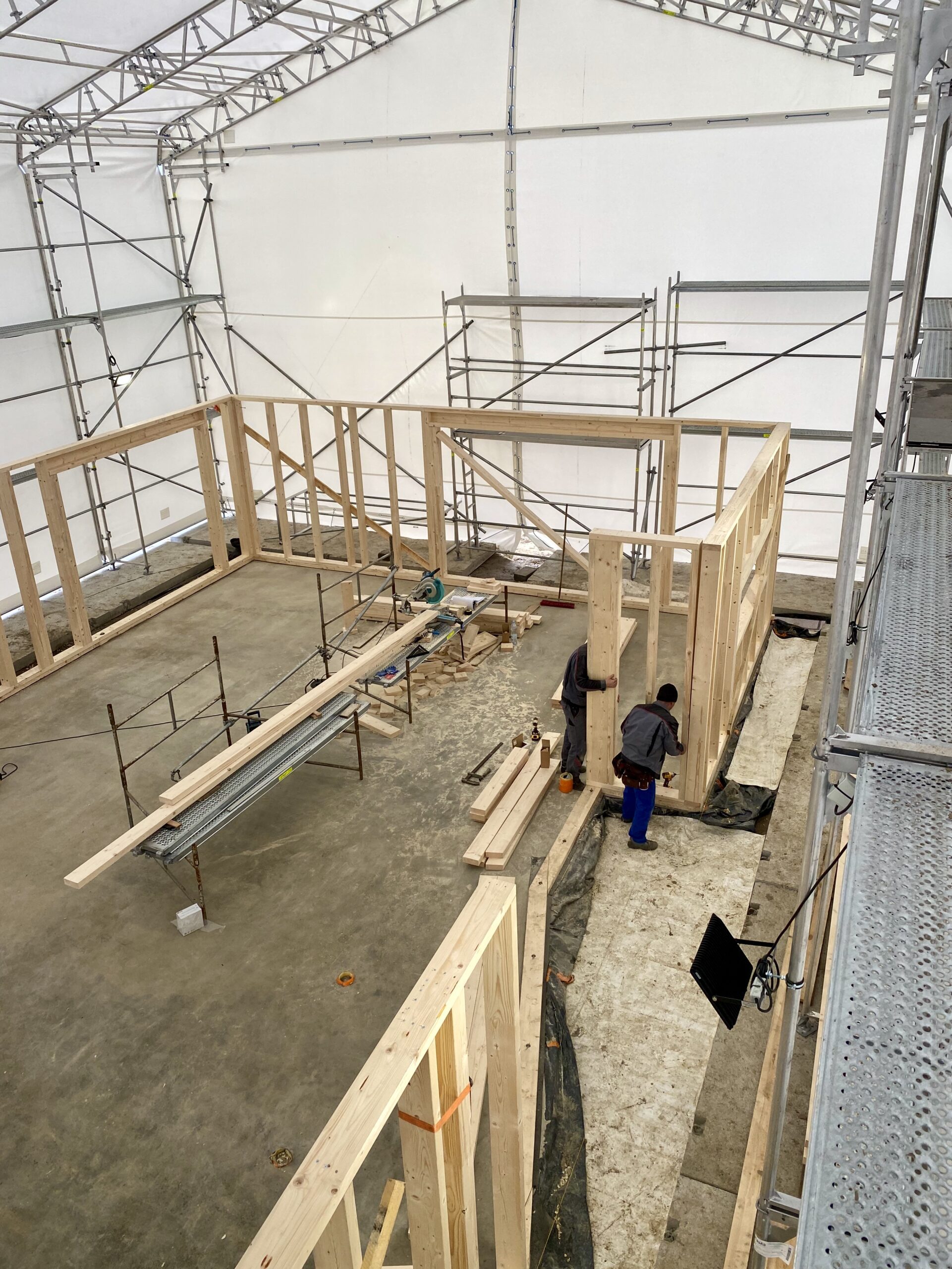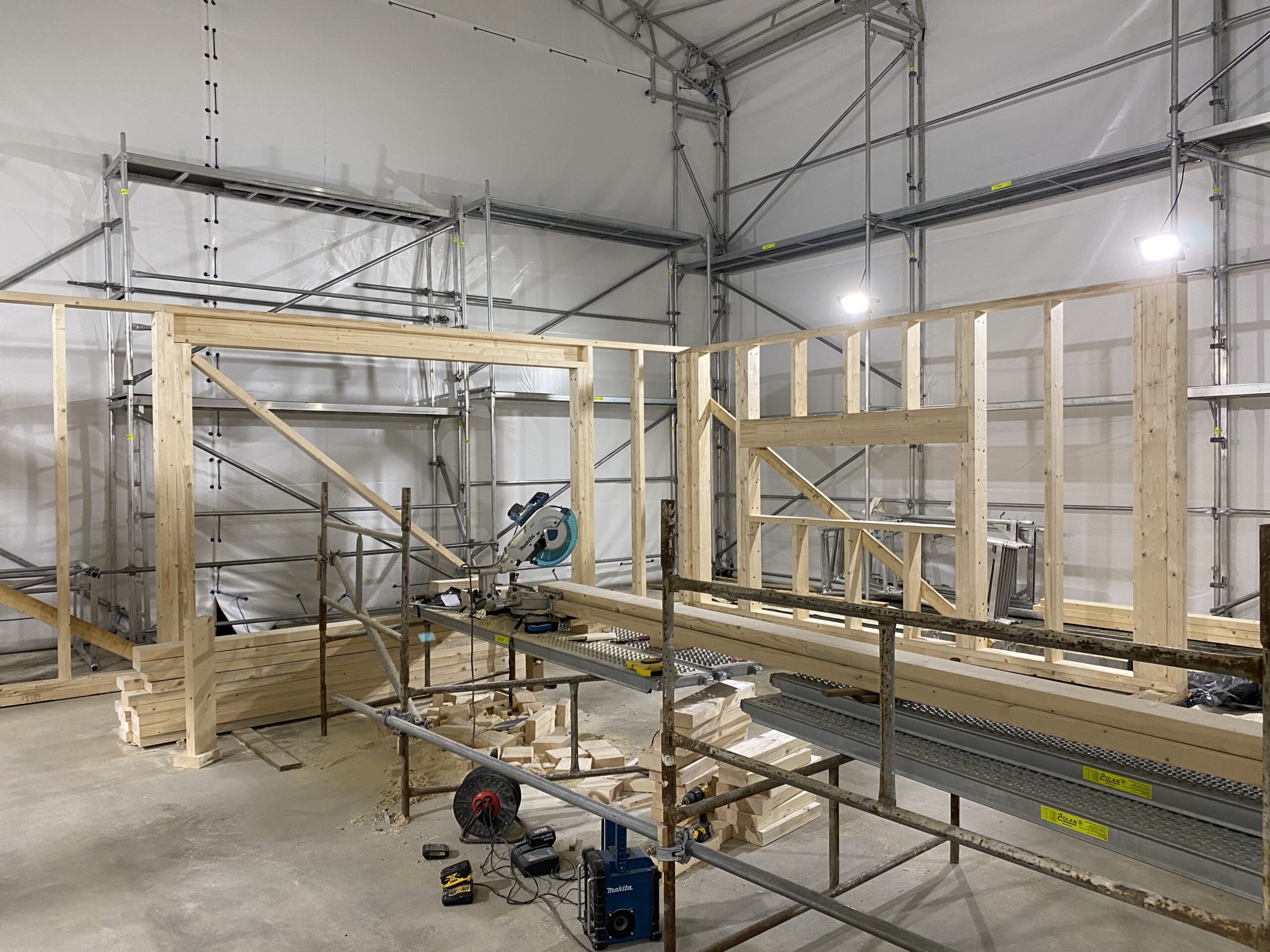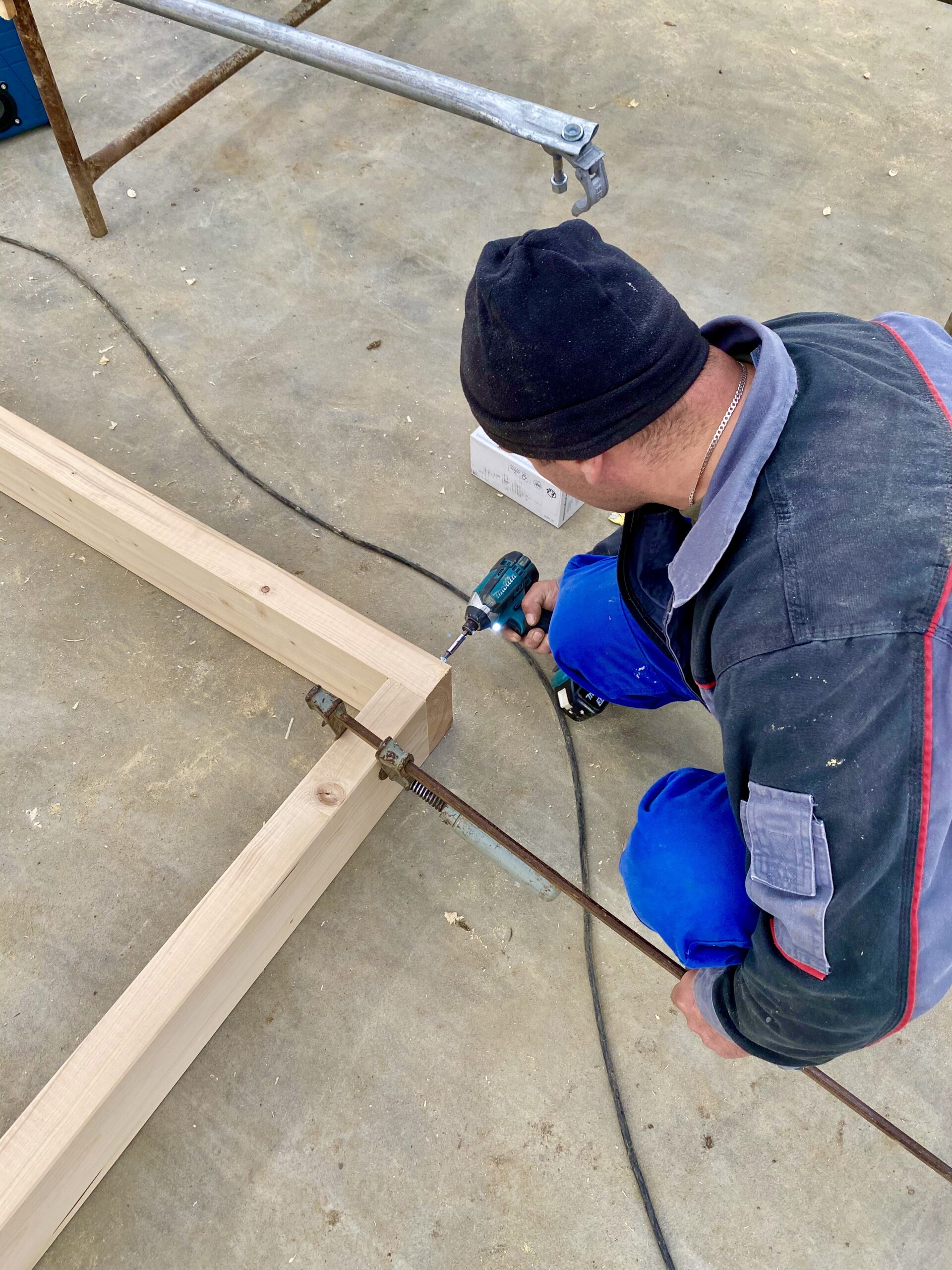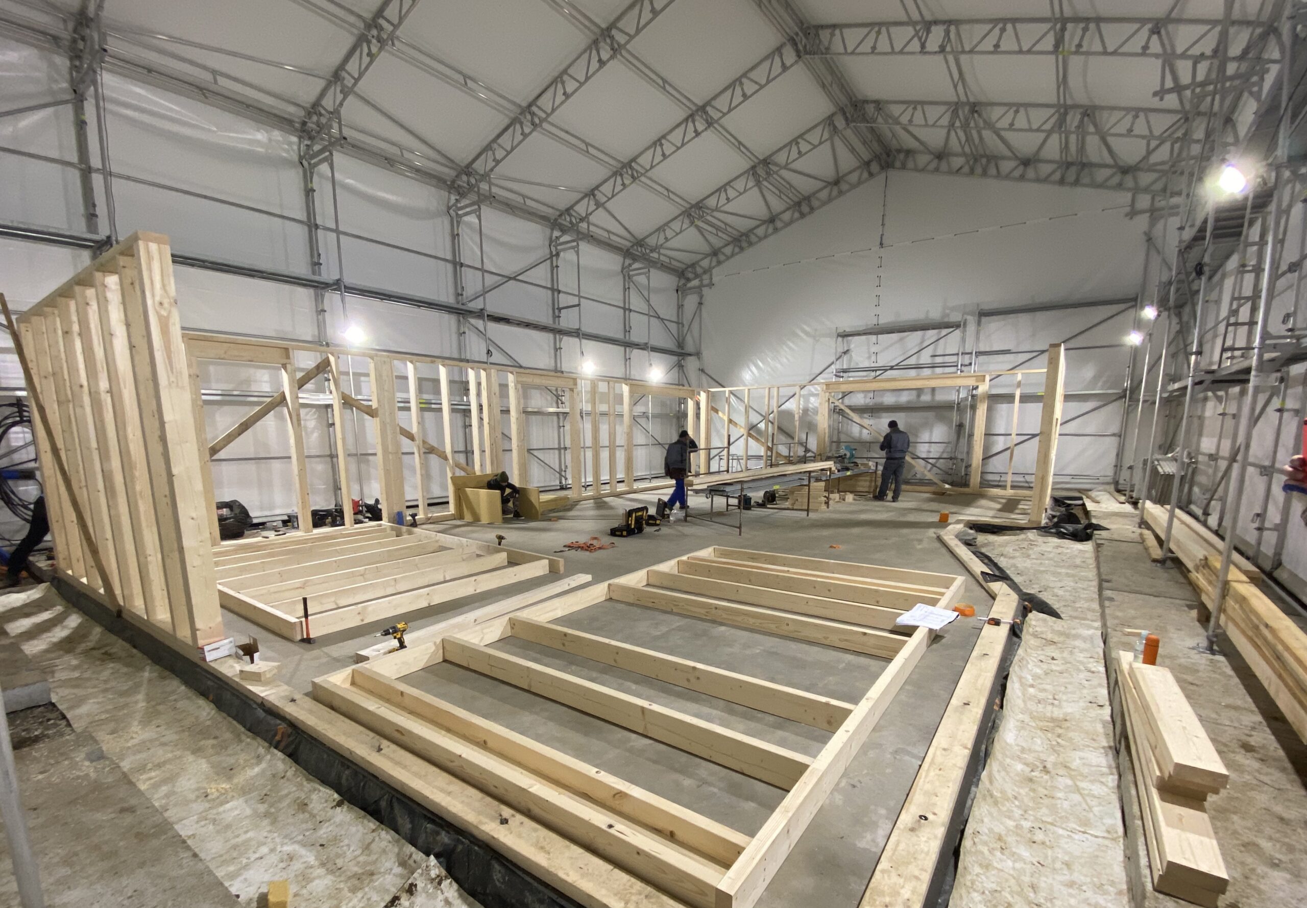 Pierwszymi elementami ściany konstrukcyjnej są naroża obiektu. Po ich zespoleniu, ustawiamy elementy pod kątem prostym względem siebie i tymczasowo dokręcamy elementy do podłoża. Konstrukcję ścian usztywniamy nie tylko za pomocą zastrzałów, ale również za pomocą deski przykręconej pomiędzy norożnymi ścianami – po szczytach oczepów.