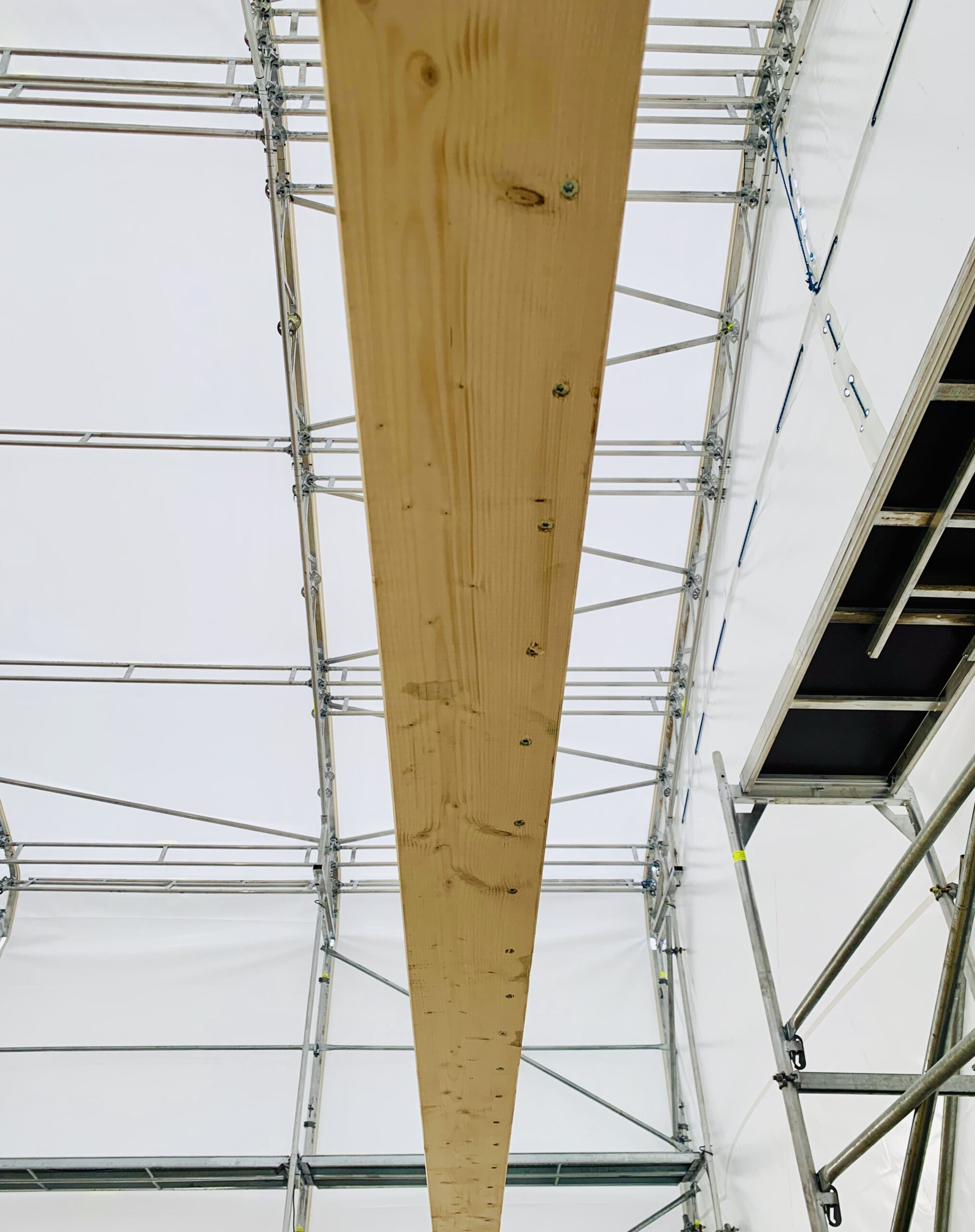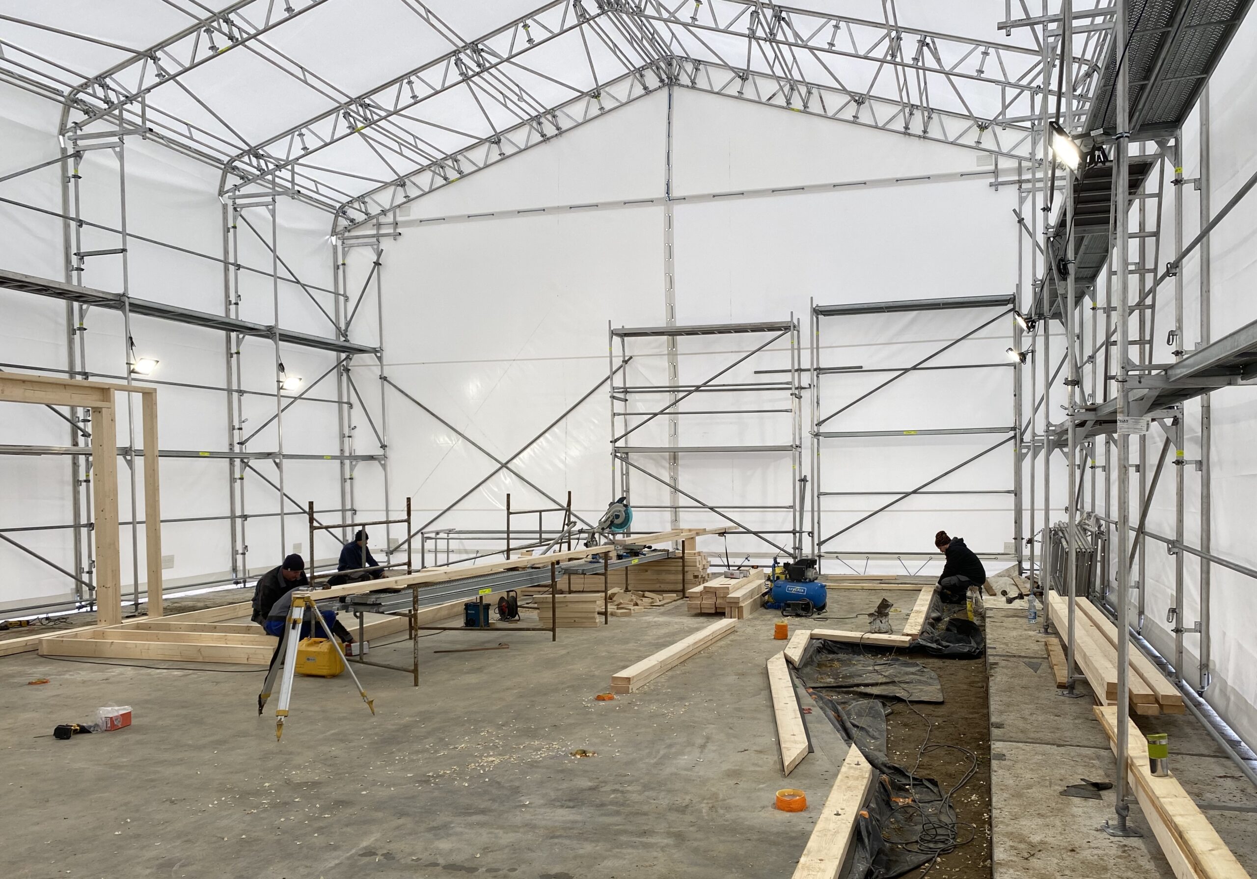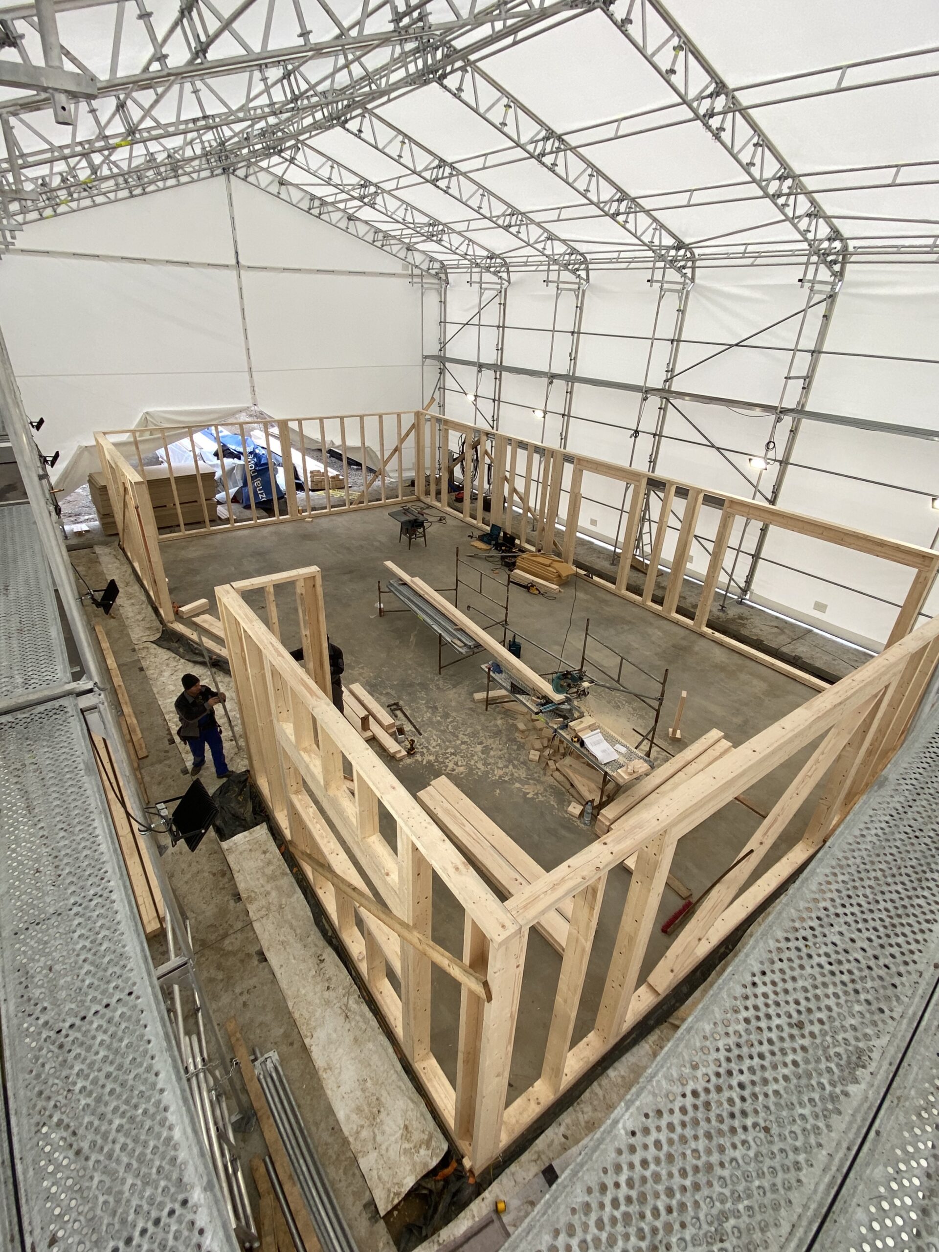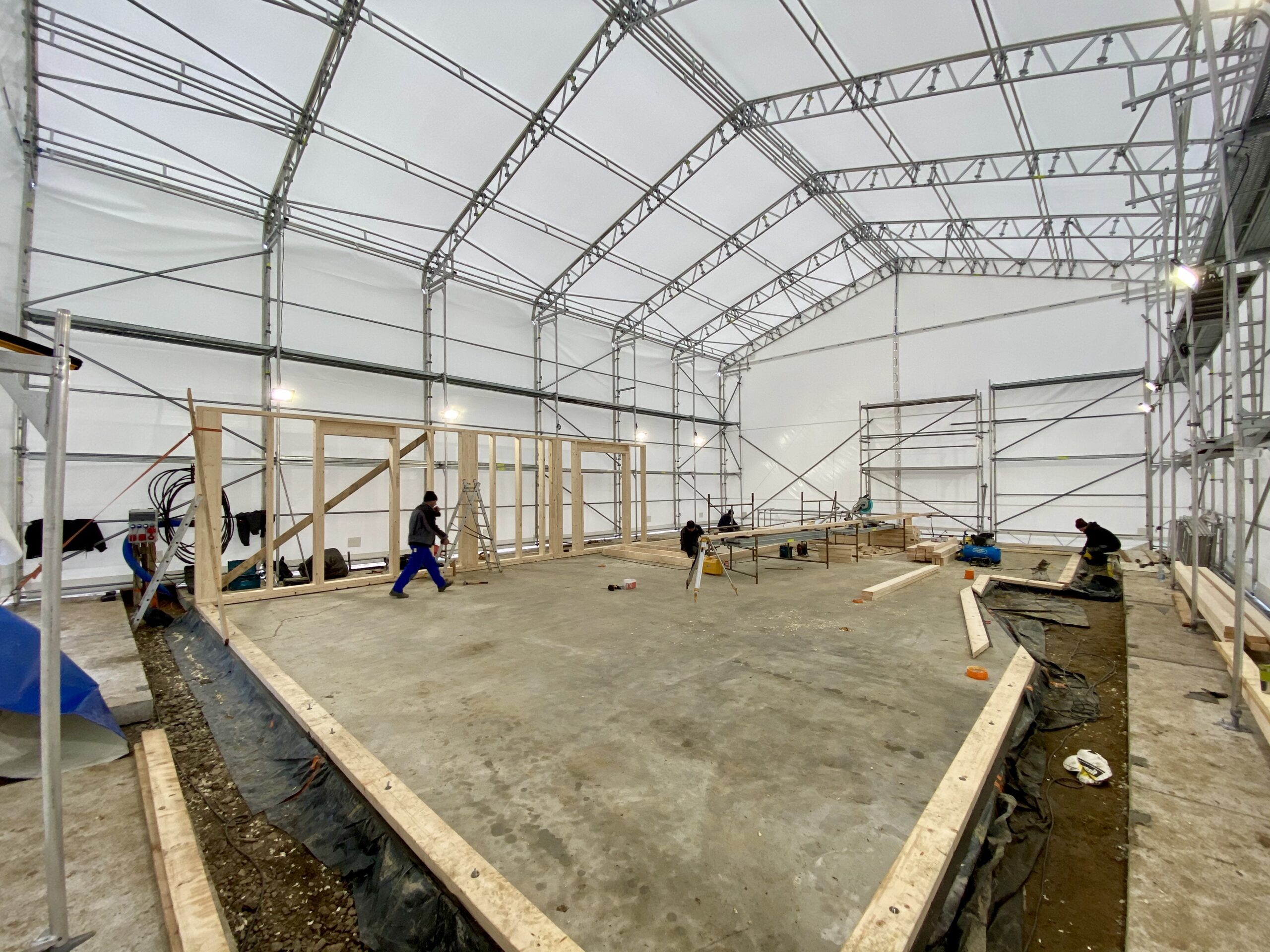 Pierwszymi elementami ściany konstrukcyjnej są naroża obiektu. Po ich zespoleniu, ustawiamy elementy pod kątem prostym względem siebie i tymczasowo dokręcamy elementy do podłoża. Konstrukcję ścian usztywniamy nie tylko za pomocą zastrzałów, ale również za pomocą deski przykręconej pomiędzy norożnymi ścianami – po szczytach oczepów.