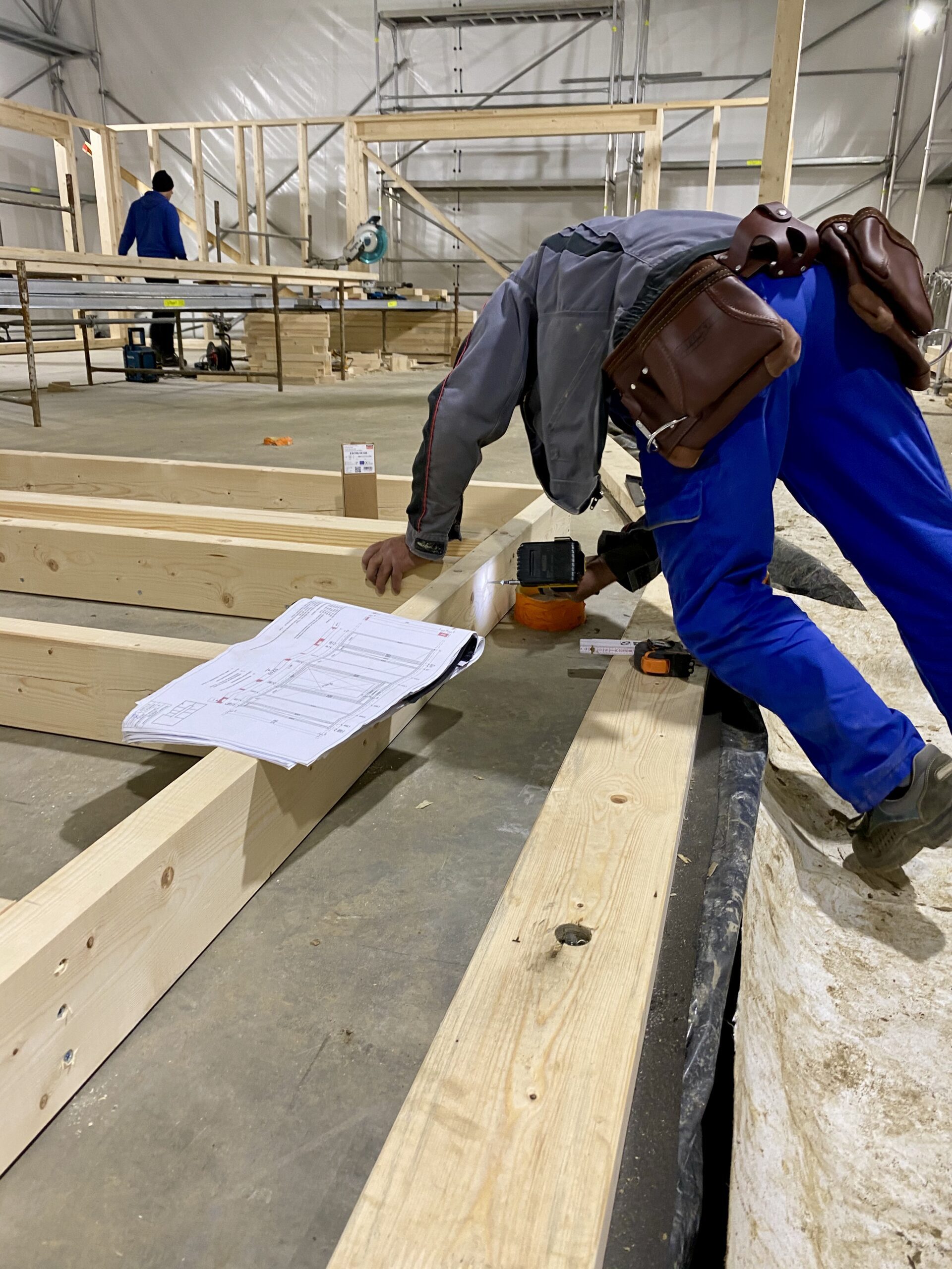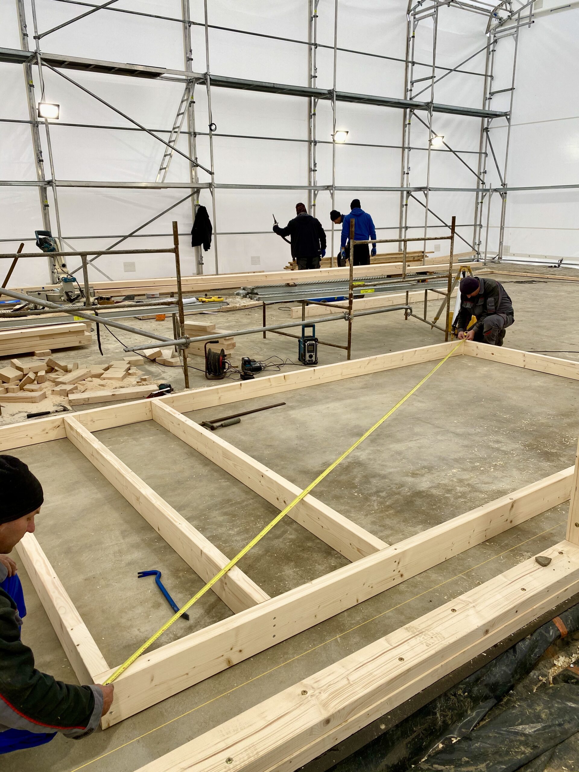 Po rozstawieniu wszystkich ścian konstrukcyjnych zewnętrznych, spozycjonowaniu narożników, a także wypchnięciu za pomocą tymczasowych podpór i pasów montażowych ścian obiektu – tak aby stanęły w pionie, należy ponownie dokonać pomiarów kontrolnych.