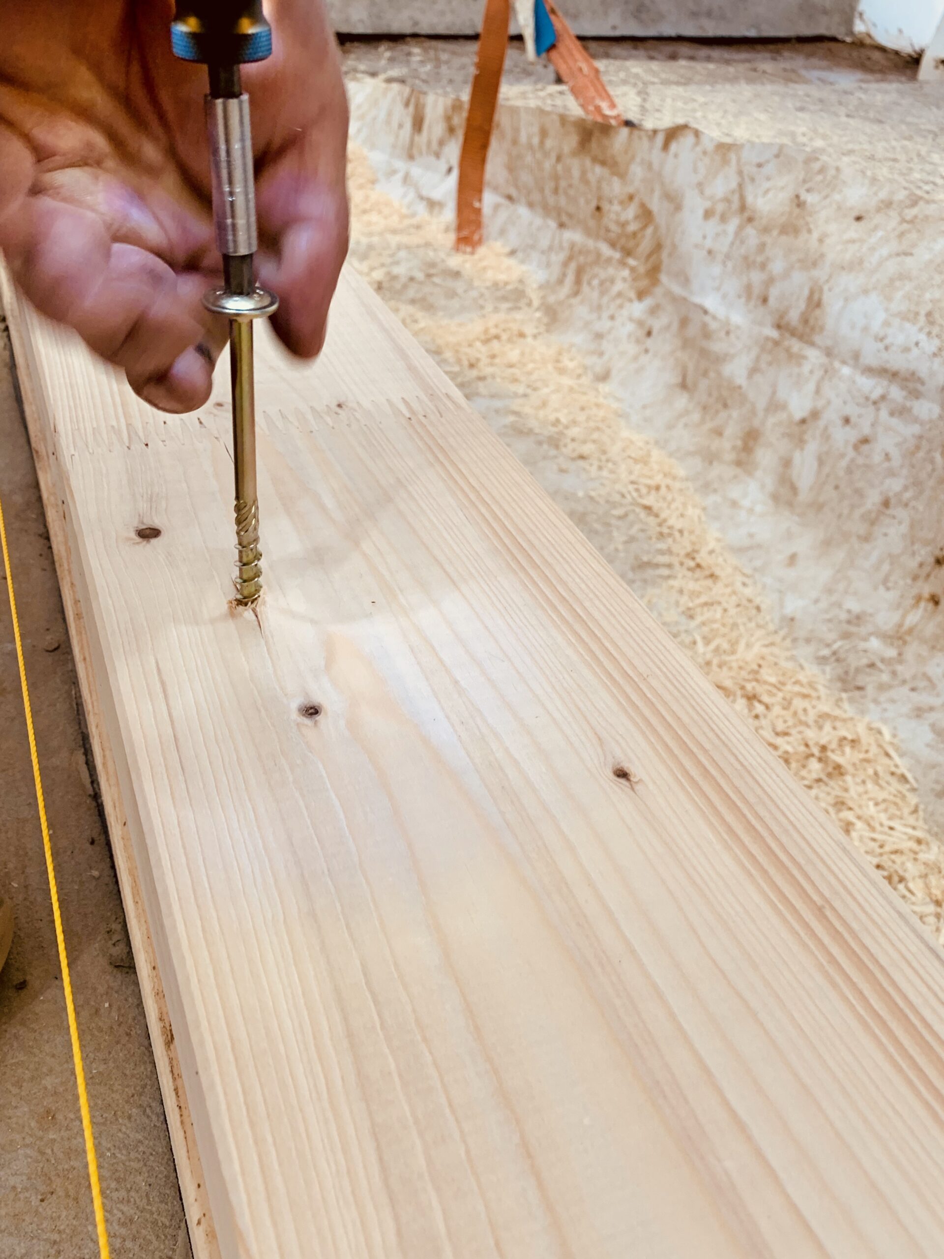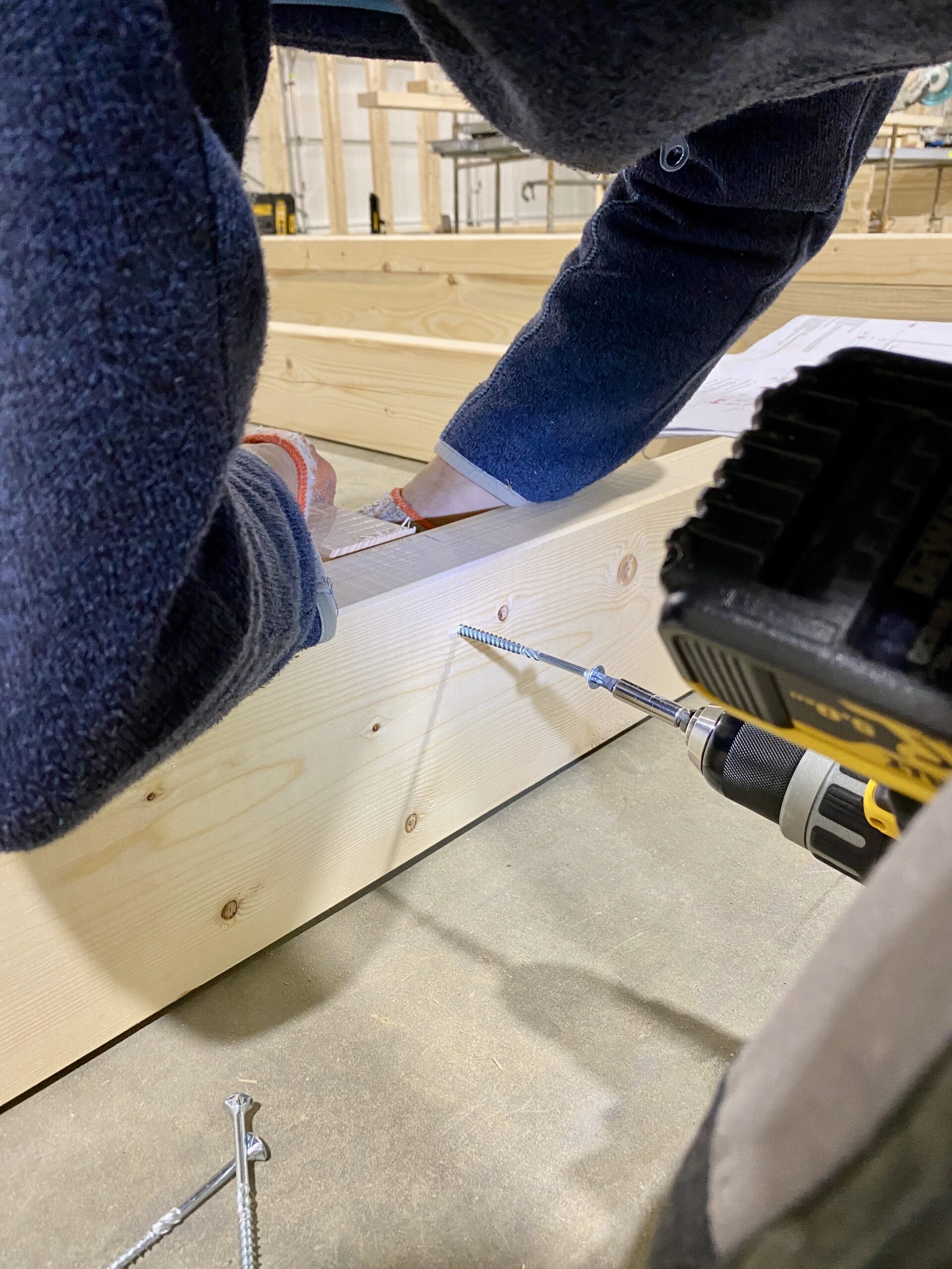 Montaż ścian zewnętrznych rozpoczynamy od skręcenia prefabrykatów – prefabrykaty skręcamy w oparciu o dwa dokumenty – kartę obrazującą ścianę konstrukcyjną, ale również zestawienie detali konstrukcyjnych. Ściany zewnętrzne skręcamy łącznikami (wkrętami) o średnicy 6mm i długości 120mm. Każde połącznie elementów pionowych z poziomymi to minimum 3 wkręty.