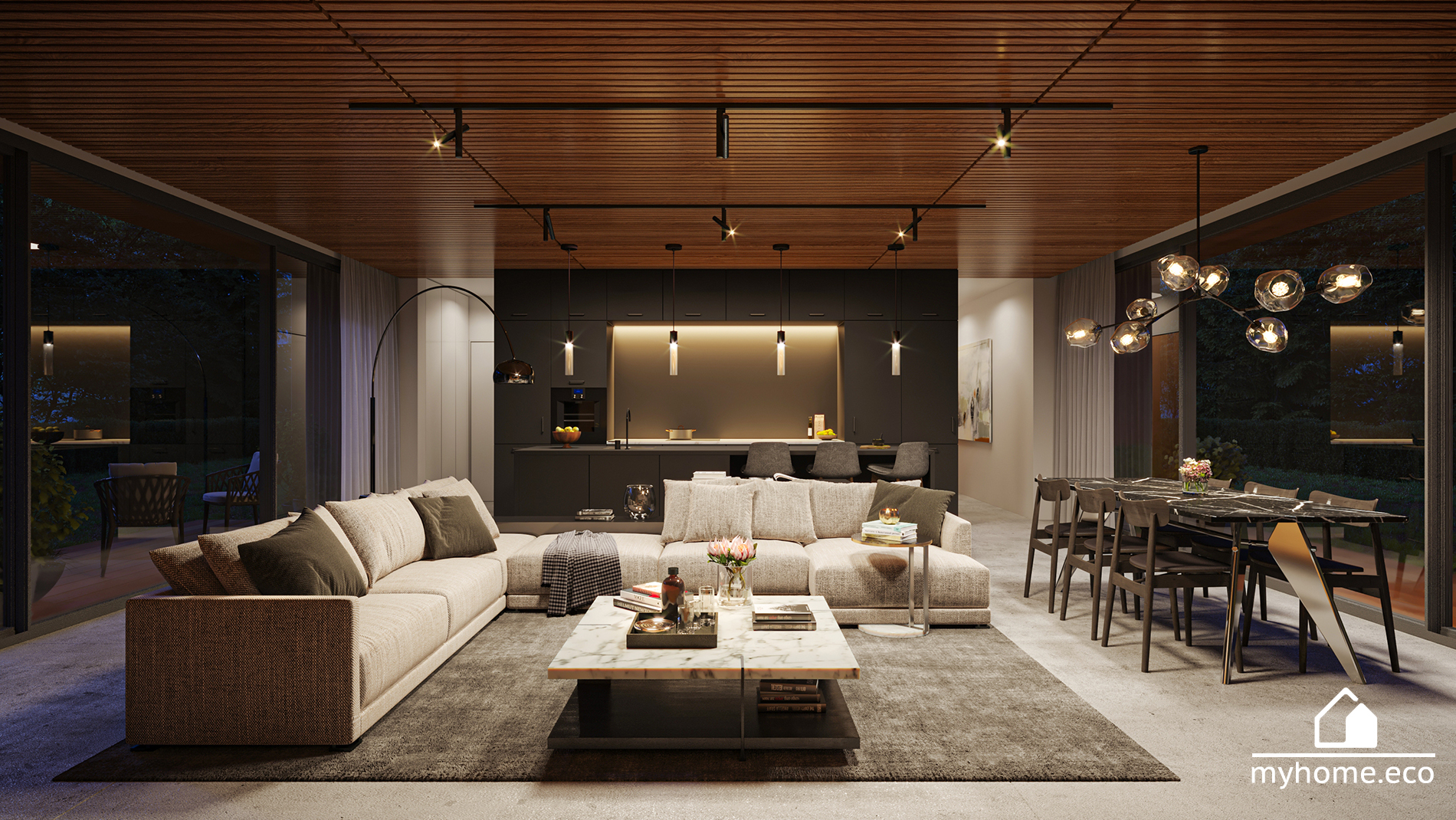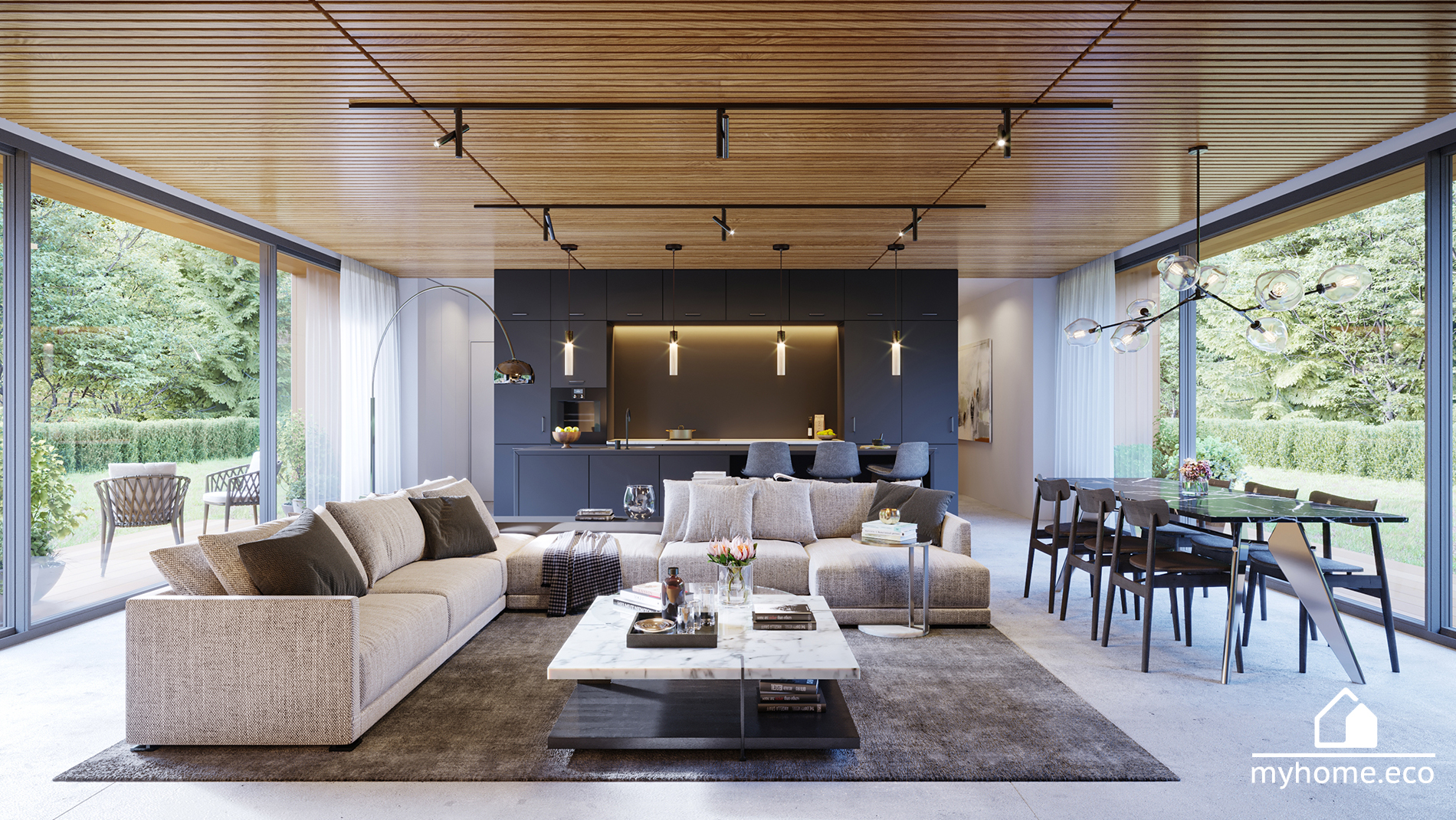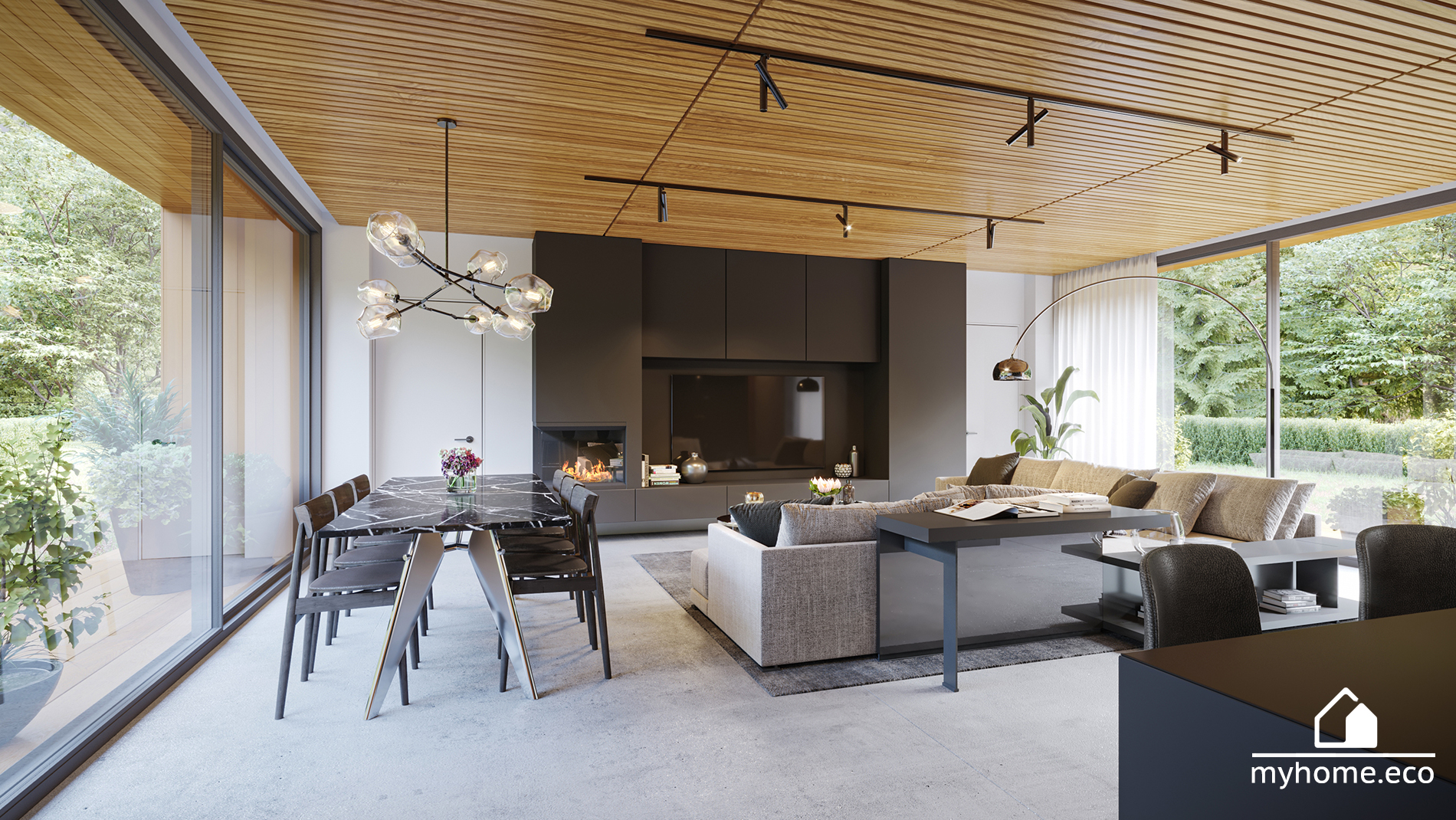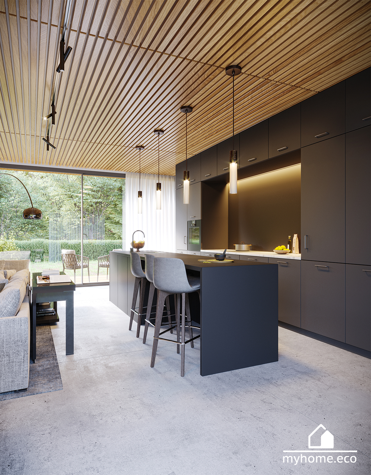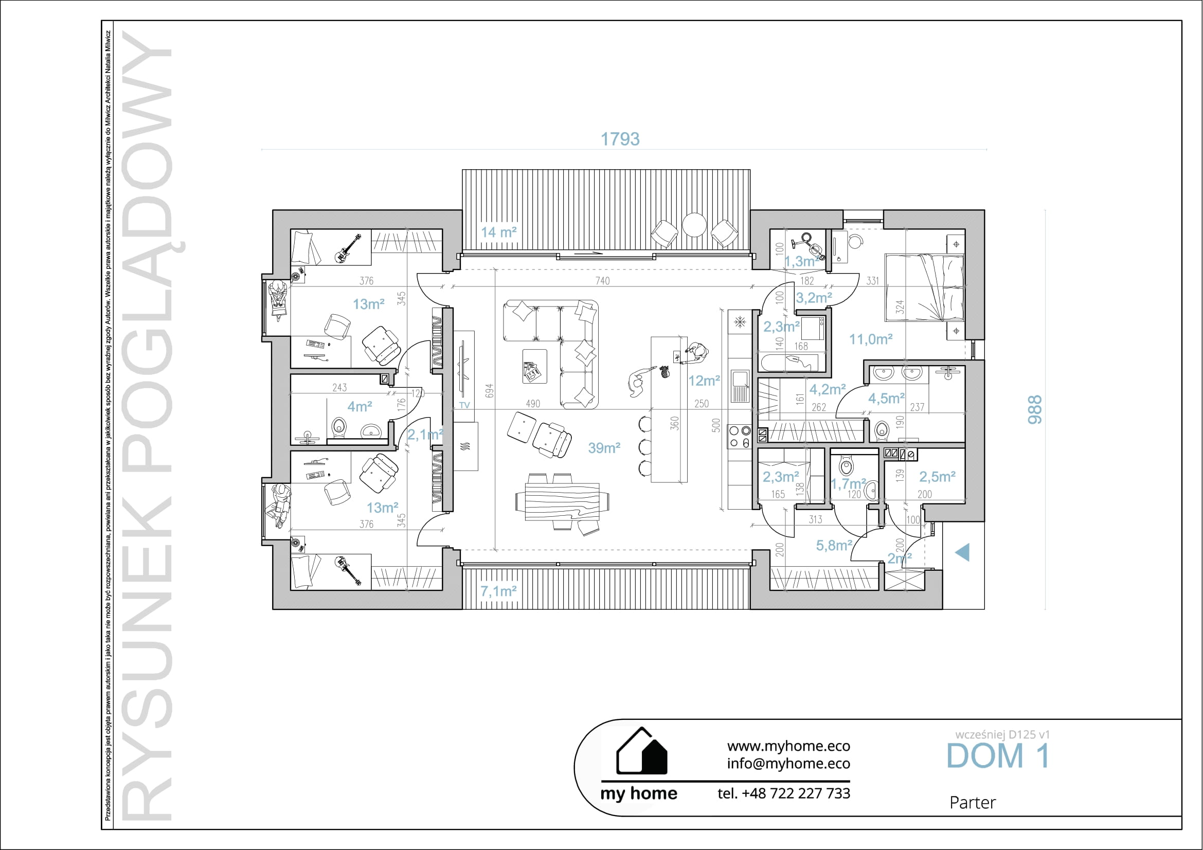Gotowy projekt DOM 1Pracowni MyHome.eco jest ewenementem pod względem wykorzystanej przestrzeni – korytarze zostały zmniejszone do minimum! Budynek zaprojektowany w stylu nowoczesnej STODOŁY, tworzący prostą i ekonomiczną w budowie bryłę, nie generując zbędnych kosztów w postaci skomplikowanych połaci dachowych. Minimalistyczne i trwałe materiały elewacyjne, tworzą dom o ponadczasowej stylistyce, eleganckiej i wyważonej.