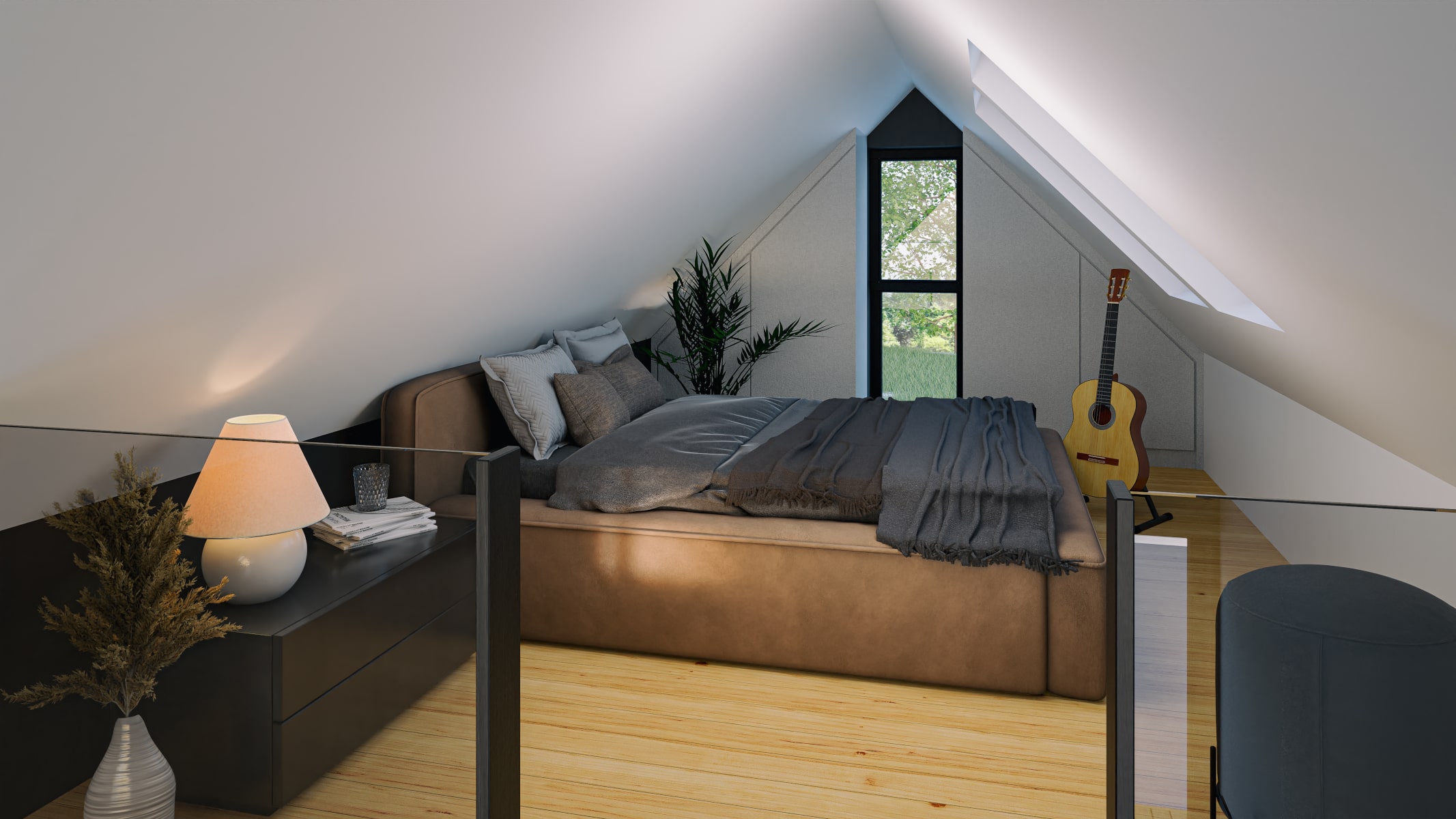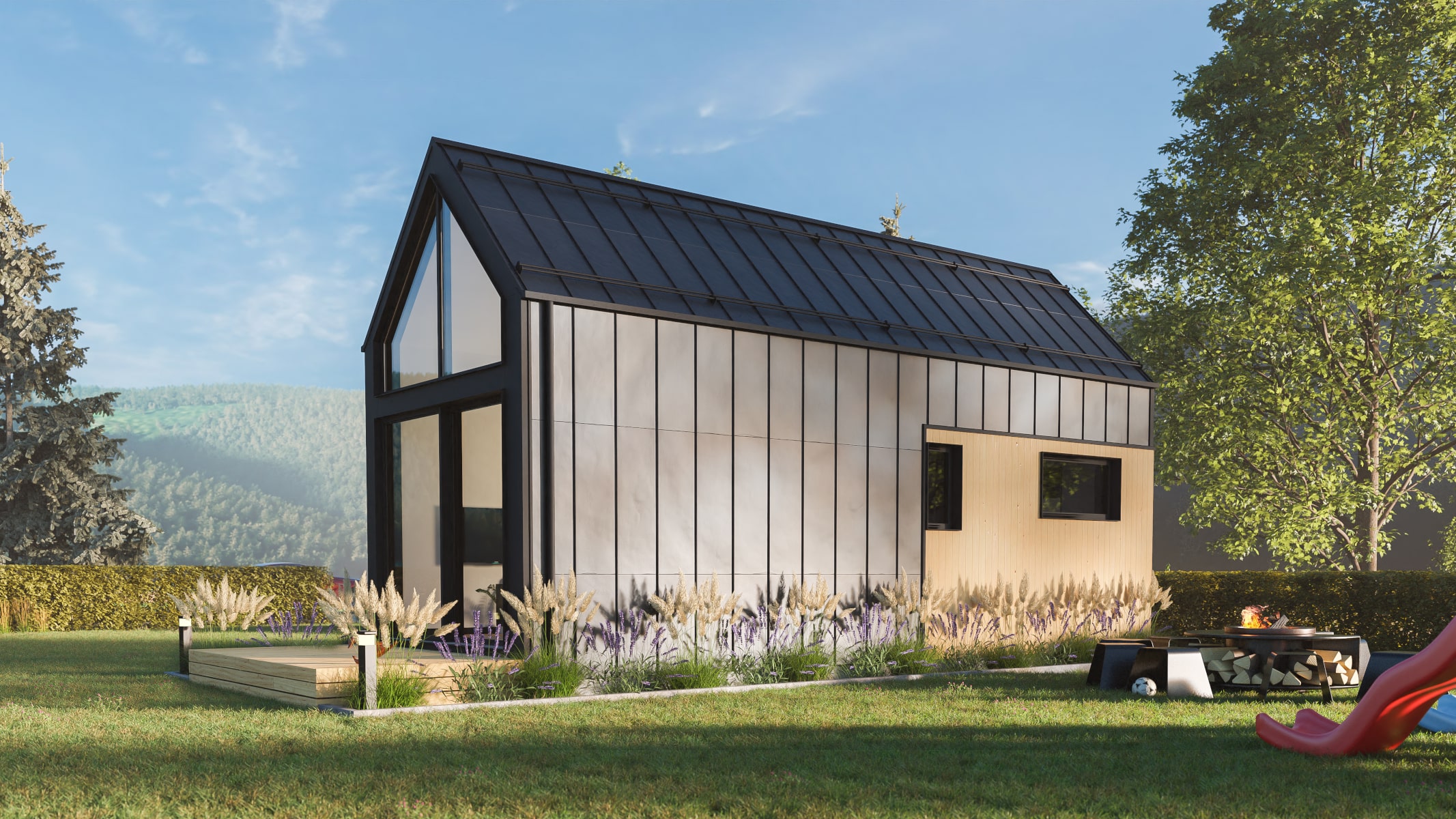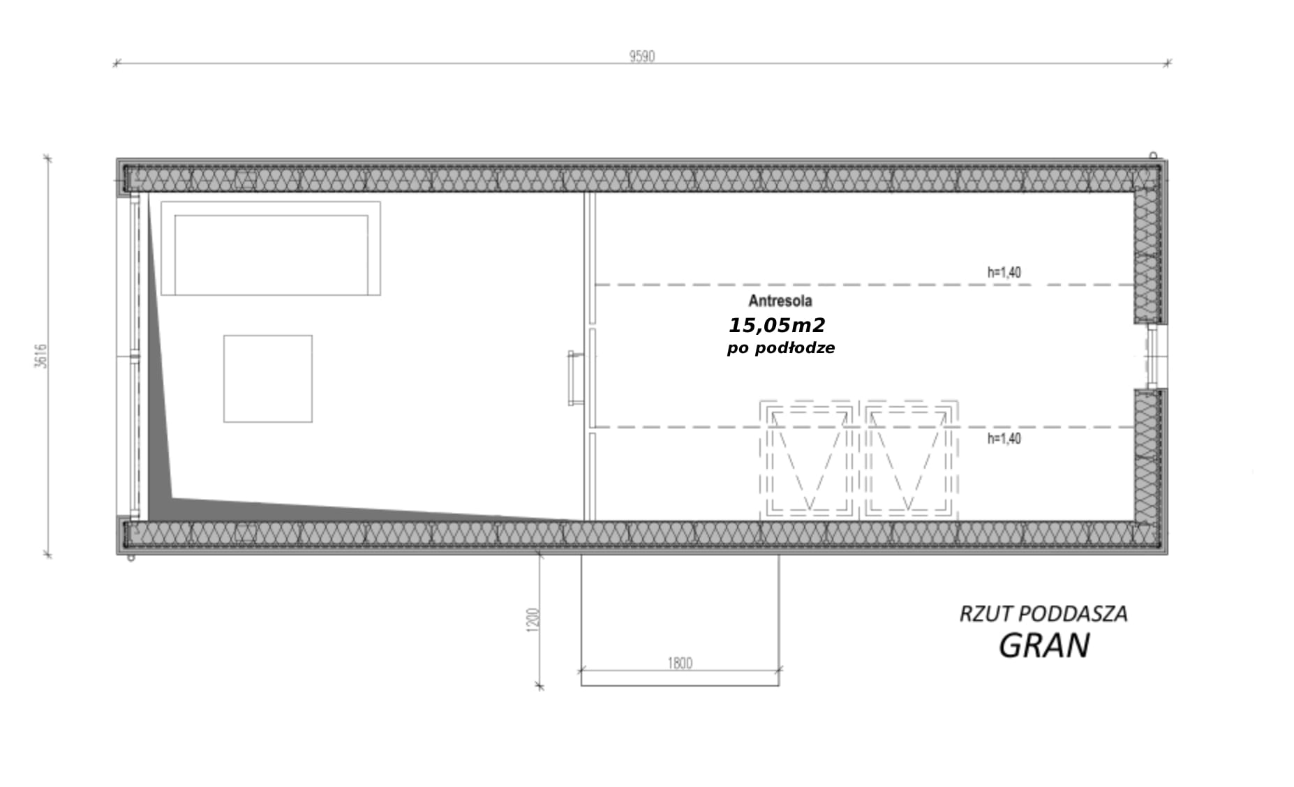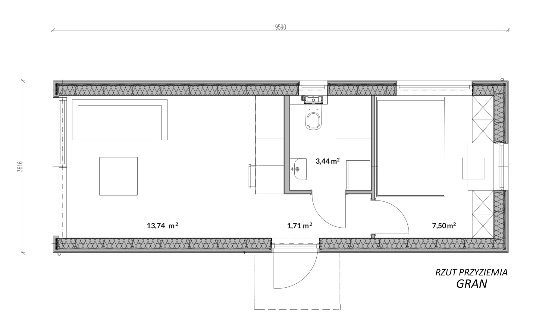 Projekt GRAN to nowoczesny i ekologiczny dom modułowy o zwartej bryle, z dachem dwuspadowym. Duże przeszklenie w fasadzie szczytowej wprowadza przestrzeń i światło do wnętrza. W budynku wydzielono pokój dzienny z aneksem kuchennym, łazienkę i niezależną sypialnię na parterze. Dodatkowo na antresoli znajduje się miejsce do spania. Dom modułowy, całoroczny, ocieplony m.in. ekologiczną wełną drzewną, materiałem otwartym dyfuzyjnie o wspaniałych właściwościach izolacyjnych. Oddawany w stanie deweloperskim.