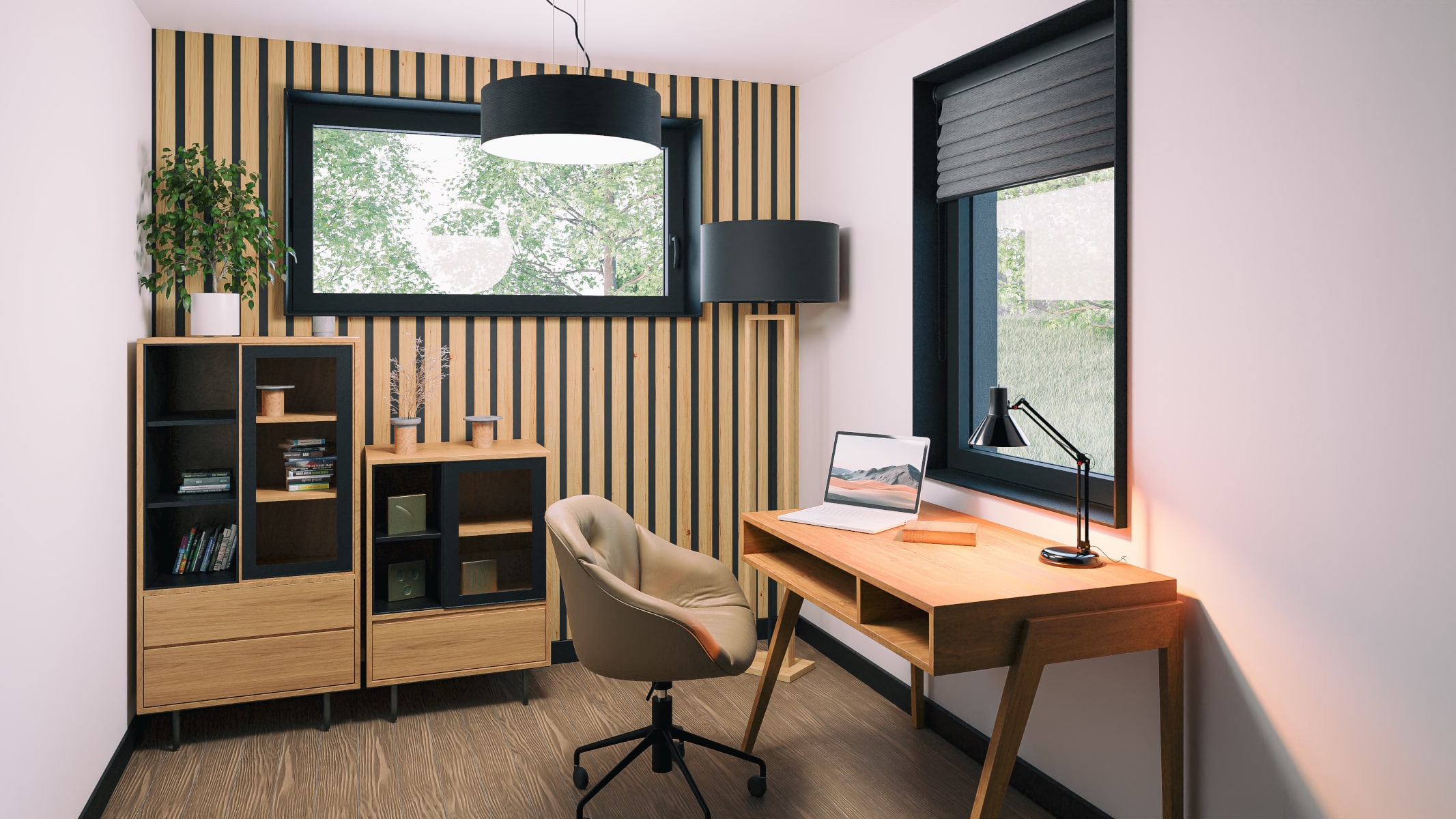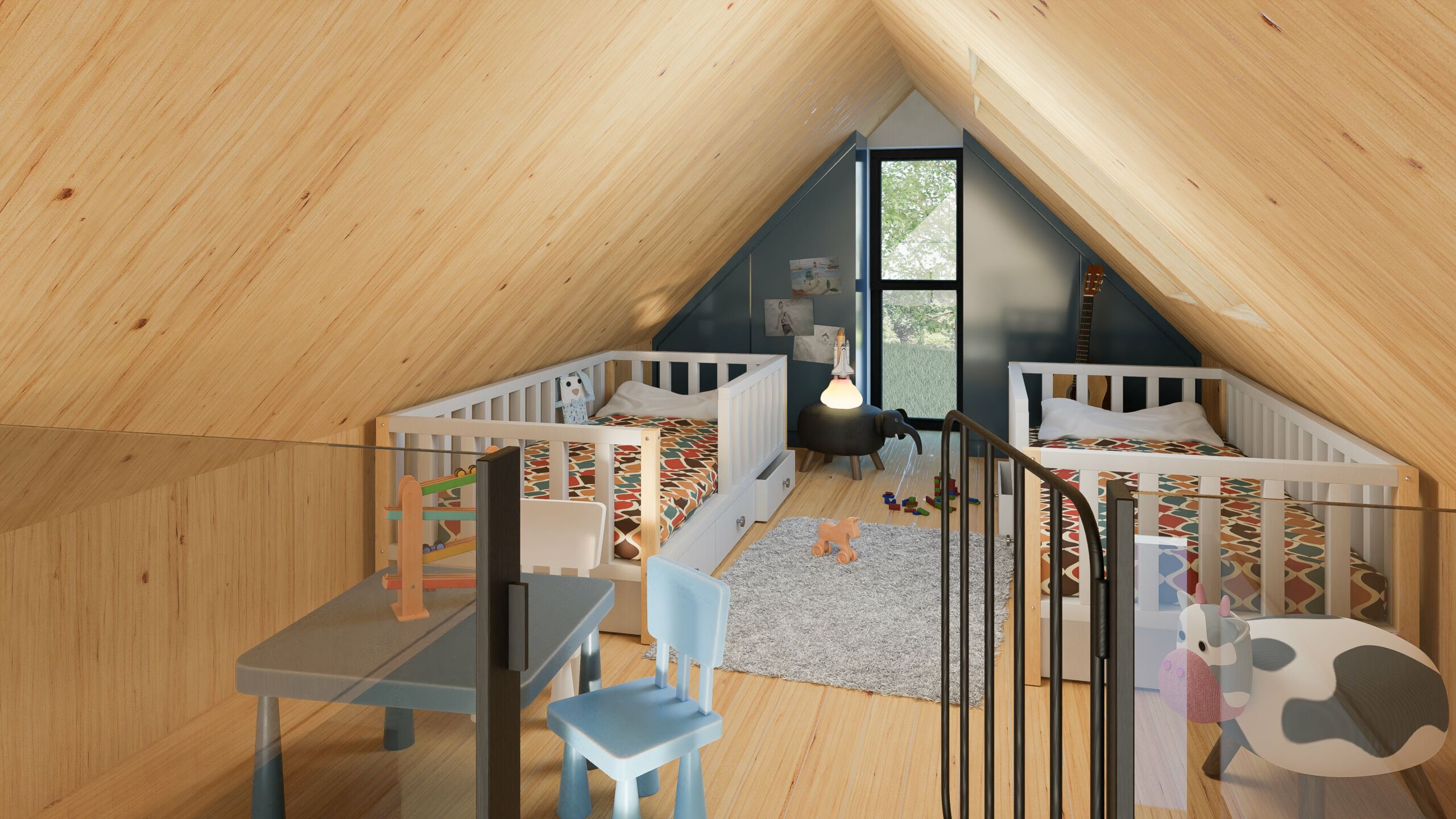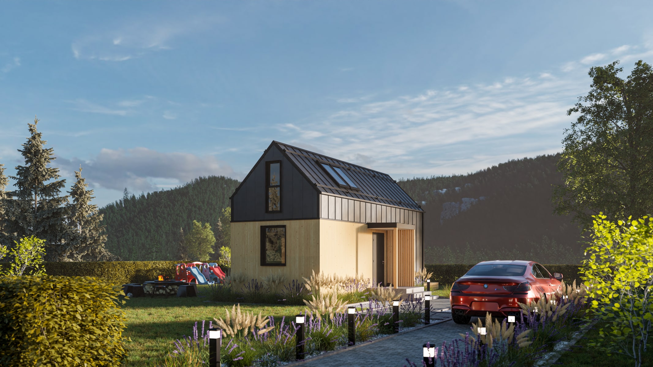 • Elewacje: wykończone świerkowymi deskami elewacyjnymi w układzie pionowym, zabezpieczone bejcą.