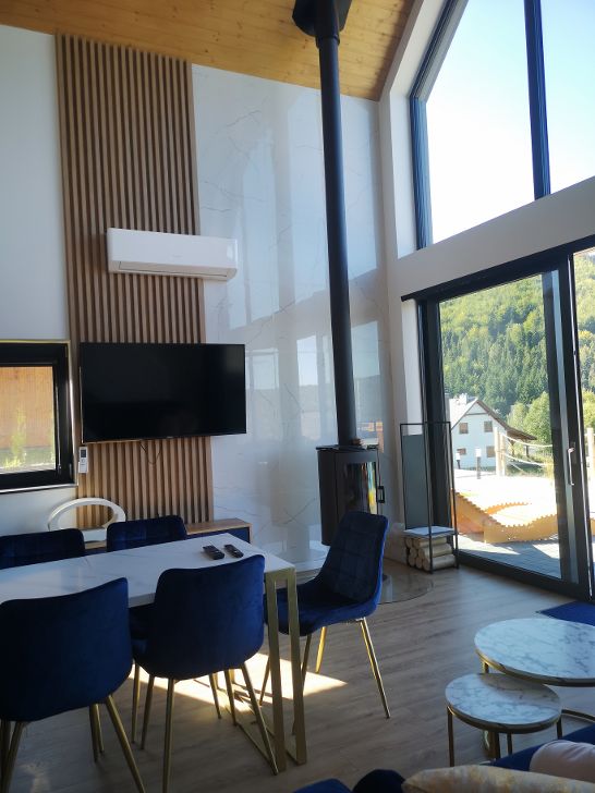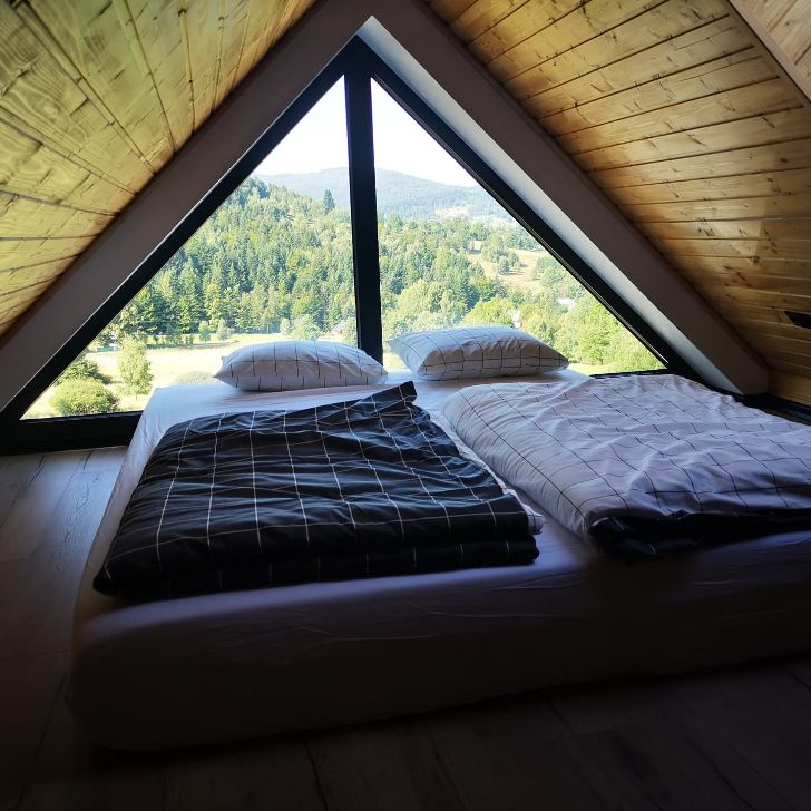Osada Mosorny Groń to dwie całoroczne STODOŁY. Każdy z domów jest inny i ma swój klimat. Domy mają powierzchnię 140 metrów kwadratowych. Znajdziecie w nich salon połączony z aneksem kuchennym i panoramiczną ścianą. To właśnie przez nią w dzień możesz podziwiać panoramę Zawoi, a w nocy oglądać gwiazdy.